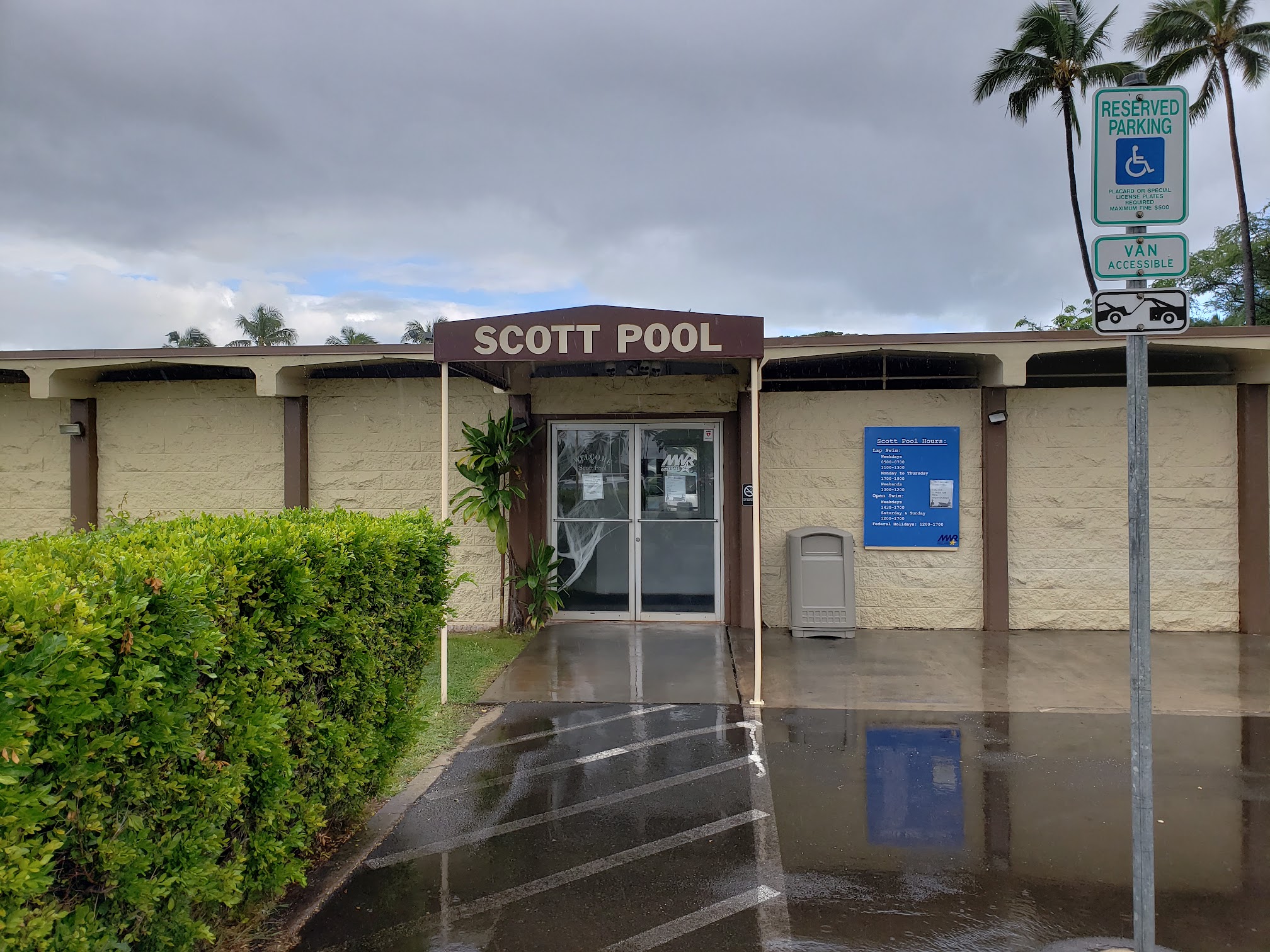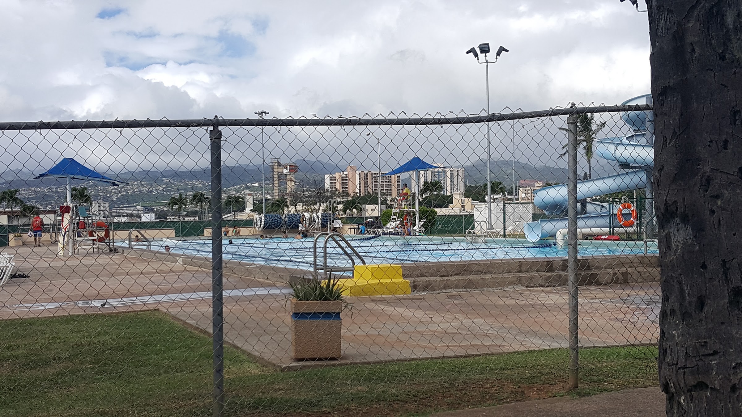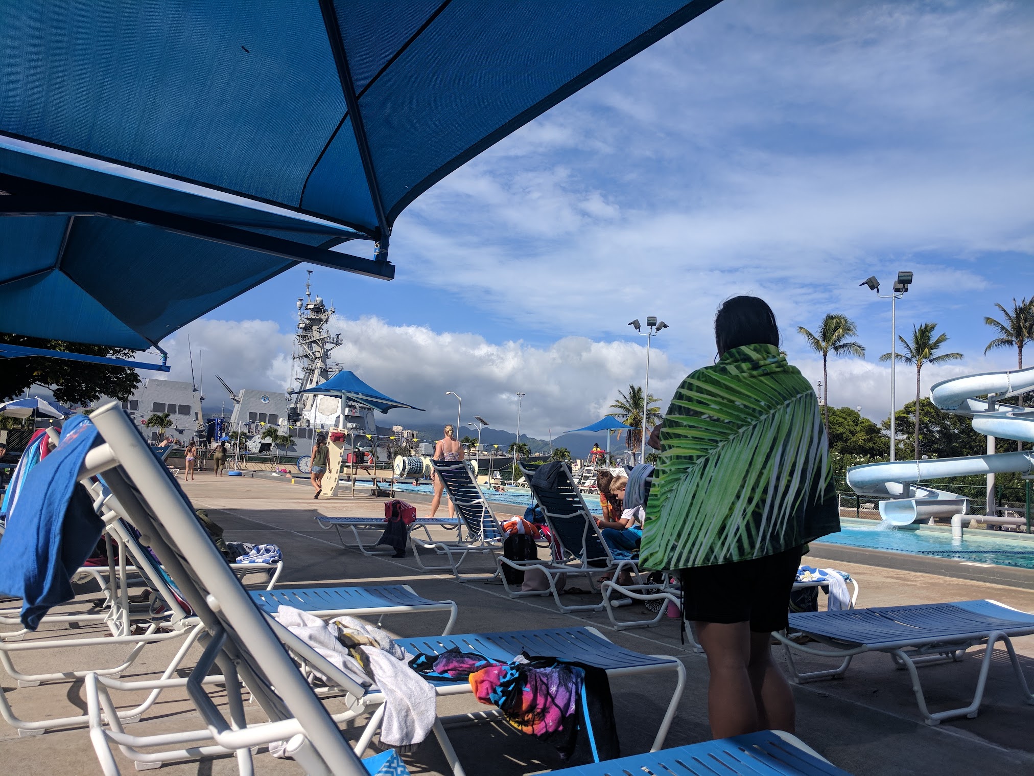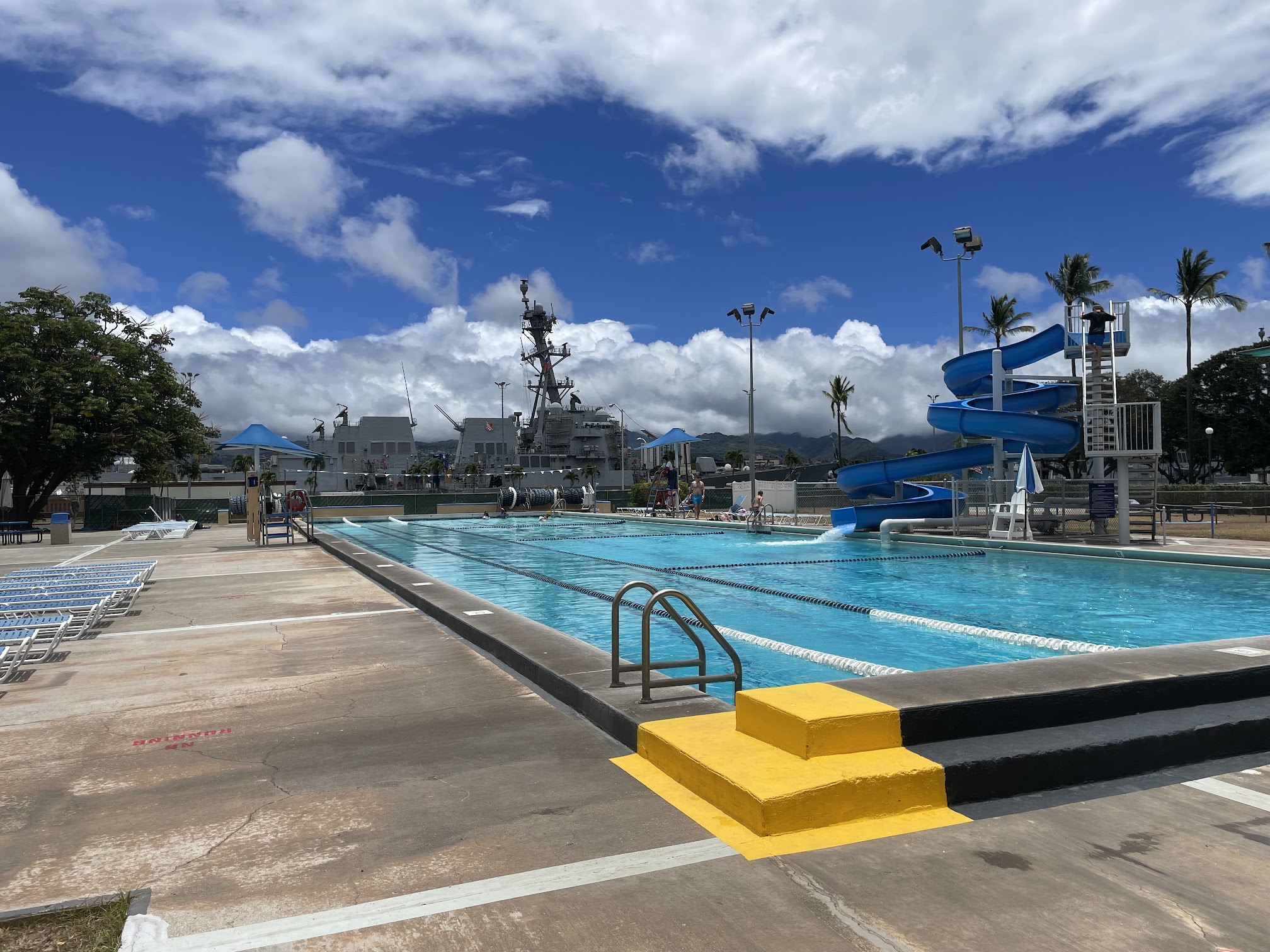 Family friendly pool located inside Pearl Harbor base. I went in the afternoon around 1600 and it wasn't too crowded. It's open until 1700 though so I don't know how crowded it gets earlier in the day. The shallow side is 5 feet deep and the diving end is 14ft. There's a water slide in the middle. Pretty fun place to go and get tanned without worrying about getting sand everywhere! Definitely recommend it!