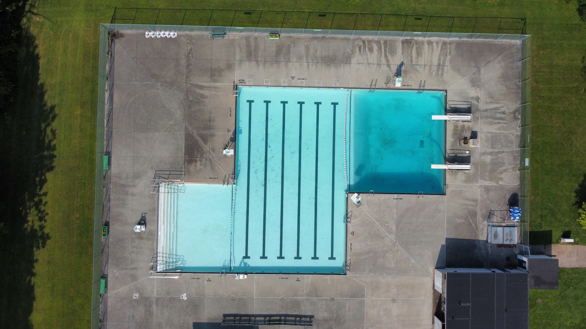 Clean, comfortable swimming pool featuring two diving boards and a 3-foot shallow end.