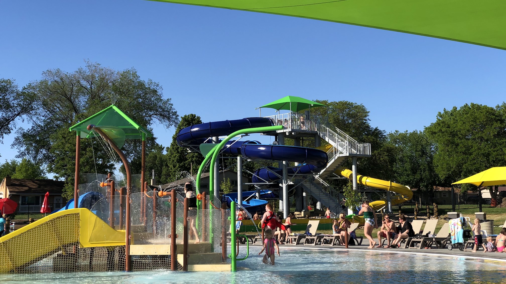 Excellent outdoor aquatic center! There is truly something for all ages so it's easy to get your money's worth. Plus, we visited the first weekend in June and the water was pleasantly warm/comfortable. As a parent, I think there is excellent visibility for you to see different sections of the water park easily. This is helpful if you have kids running in different directions. The area for little kids has zero entry, and age appropriate slides. There is quite a bit of shooting water but it's not overwhelming like some water parks. The website states that kids under 48" should wear life jackets at all times, but I didn't see this enforced. The splash pad was a hit for our kids (5) during the 10 minute break, but the water was noticeably colder. Additional areas include a lazy river, tube slide, and body slide. In the other pool, there is lap swimming, diving boards from multiple heights, rock climbing wall, lily pads, etc. I was impressed with how much seating there was distributed around the park, including some sections with shade.