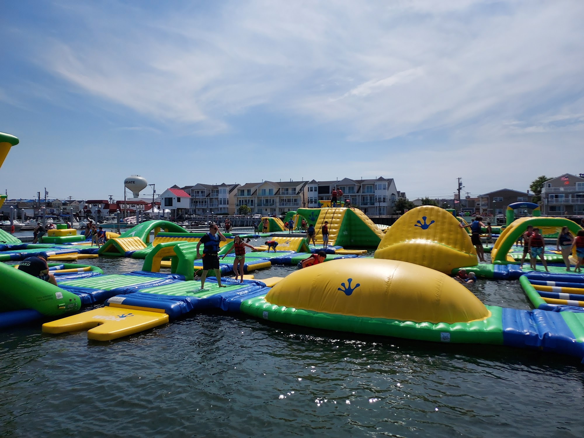 Water park in the bay with inflatable obstacles for jumping, bouncing, and splashing.