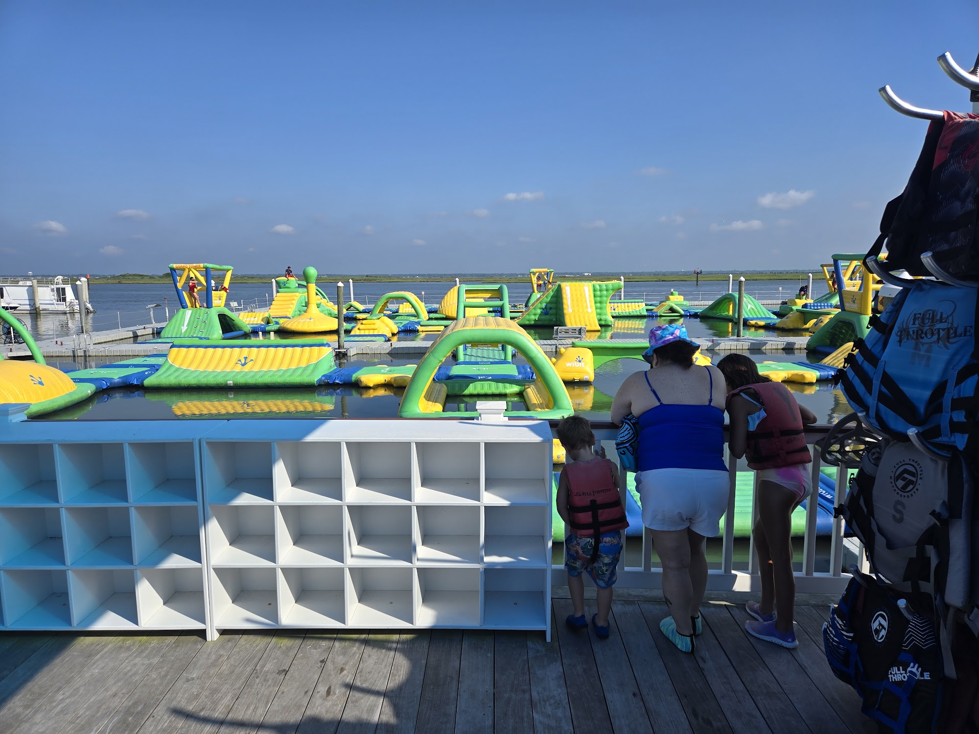 The kids had a great time. The inflatables are easy enough to walk on. They are only open during slack tide so there's not that much of a current. The place can be busy but it's also a pretty spread out. You can walk all the way around on the floating docks to watch your children play.