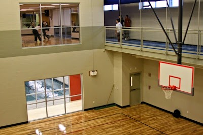 Clean, airy gym offering classes and equipment, plus track and basketball court.