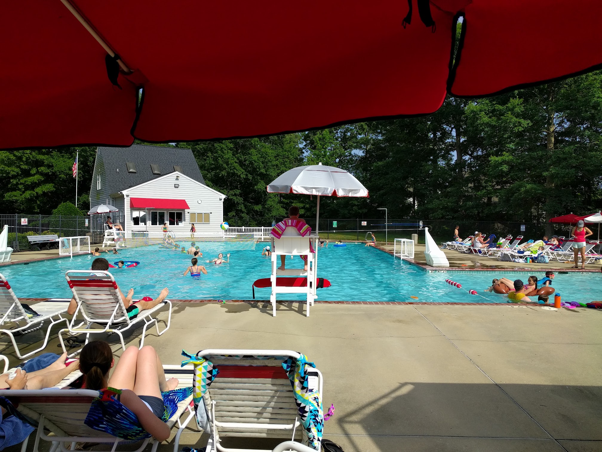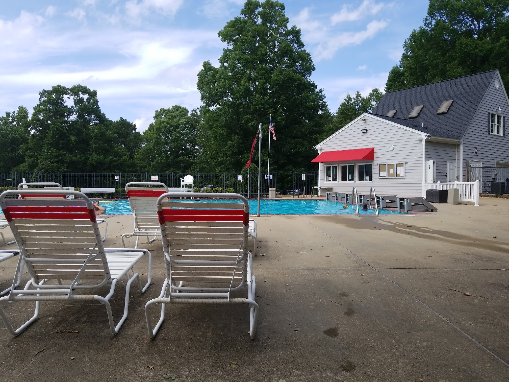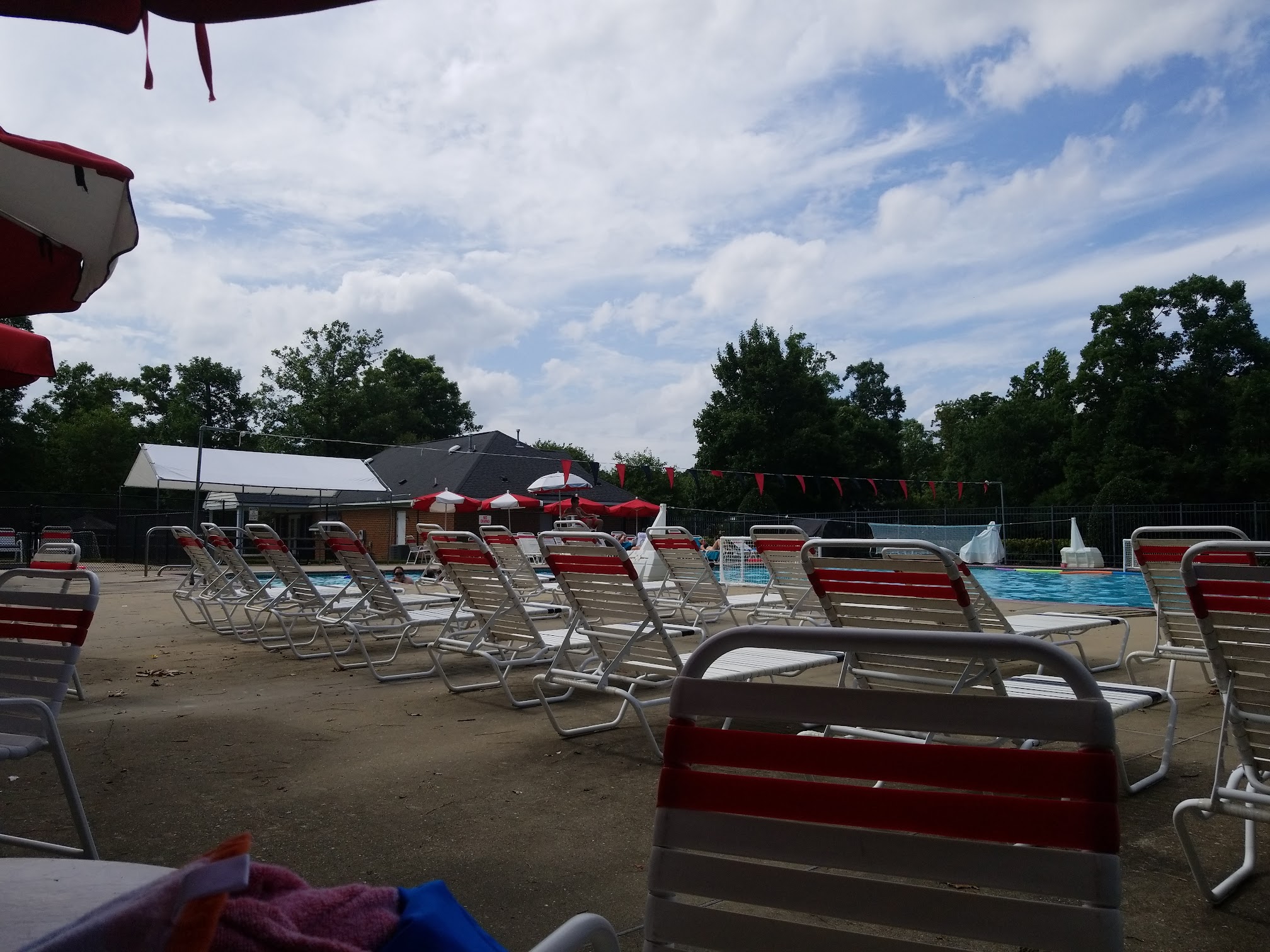 Really nice pool and nice personnel. One bathroom if I remember correctly. Up to 5 feet deep in larger pool, little pool for kids, tables with umbrellas and long chairs for laying out to get a tan. At least one lifeguard. Nice parking lot.