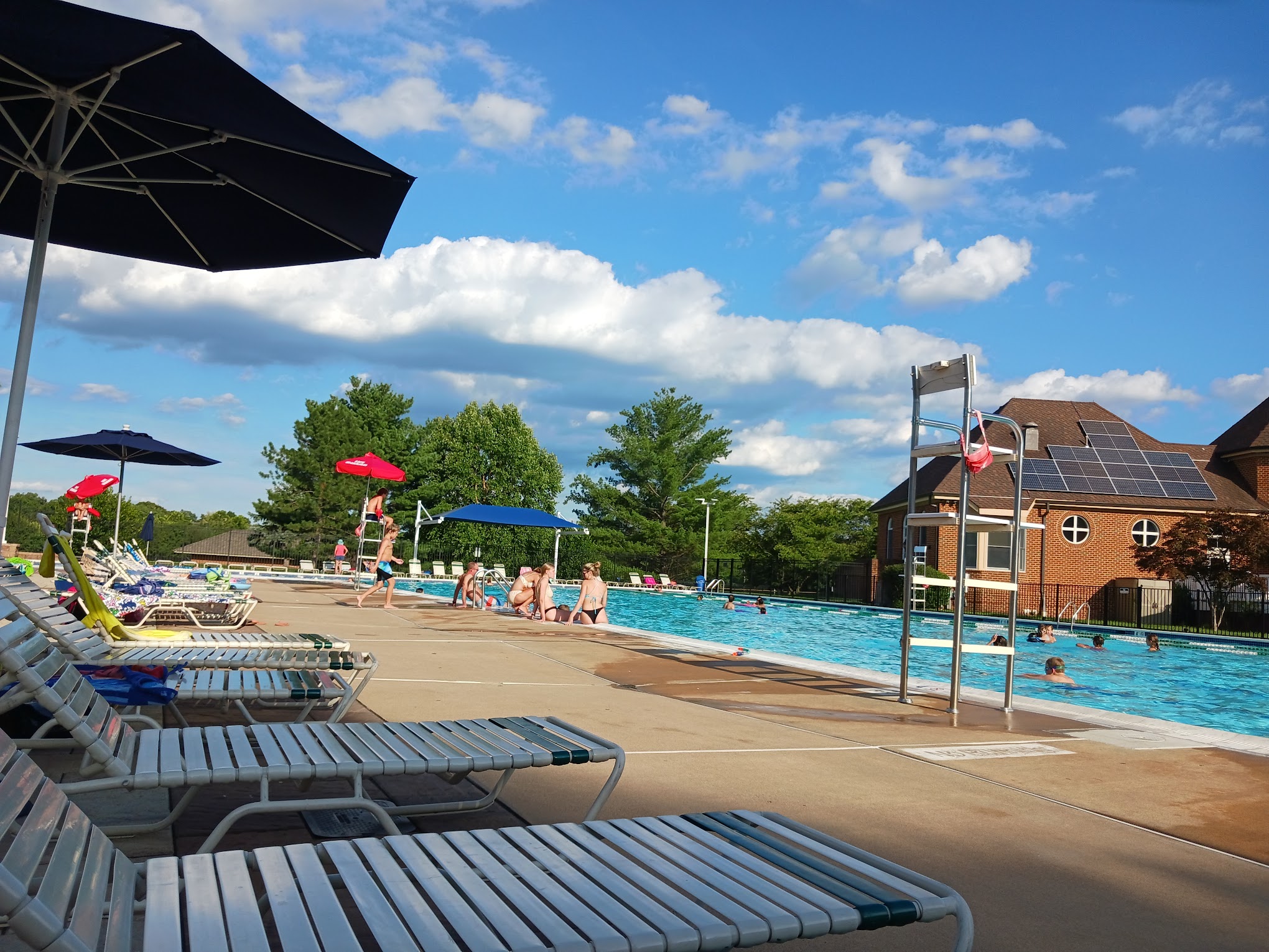 What are people saying (AI review summary)? The reviews consistently praise a recreational facility, likely a pool and park, in Ashburn, VA, as a 'great low-key place' to relax, cool off, and enjoy the sunshine. The pool is described as extra large, very clean, and well-equipped with multiple swimming lanes, a large kiddy pool, two diving boards, basketball hoops, and a ping pong table. Ample sun-bathing chairs, shaded areas, and picnic tables are available, and free goggles are provided. Safety is a highlight, with multiple attentive lifeguards always on duty and comfortable water temperatures. The facility also features a small park area with playground equipment (climbers, swings), a walking path around a pond with benches, a baseball field, and lighted tennis courts that are popular on weekends. Reviewers commend the top-notch front staff, easy electronic check-in, and the overall fun, clean, and populated atmosphere, noting its suitability for both little and big kids alike, though it's mentioned as being primarily for residents.