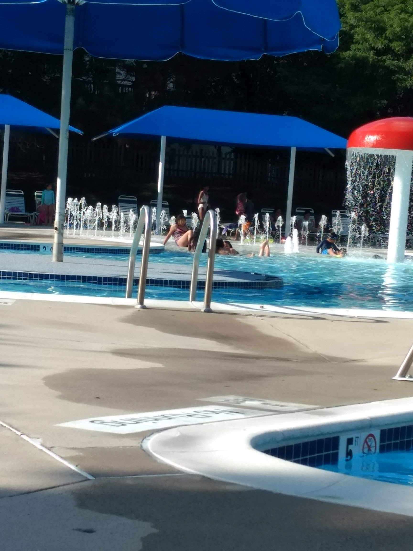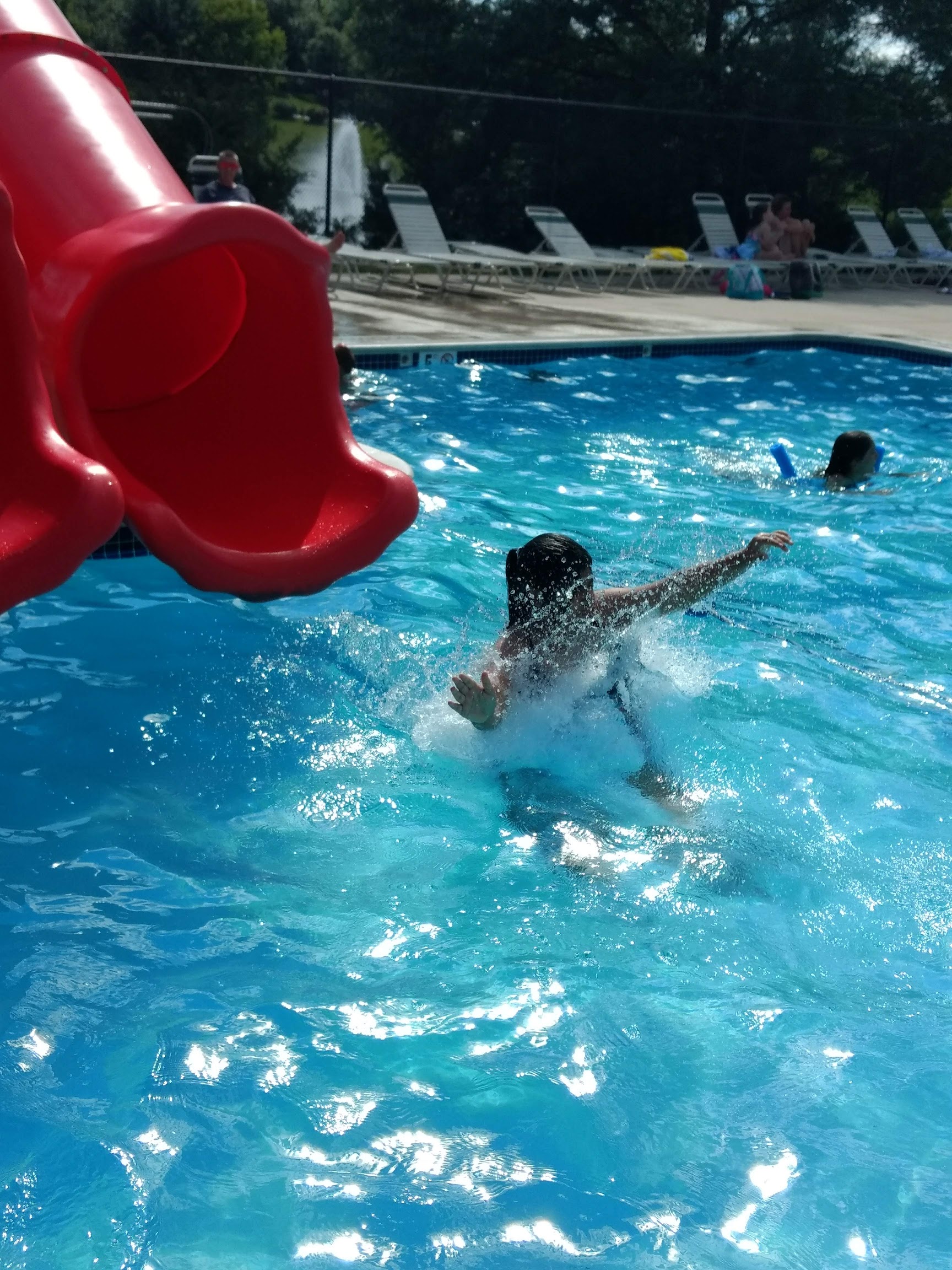 Nice pool for kids. There's a grassy area with tables and umbrellas for picnicking. There's always been plenty of lounge chairs by the pool when we have gone. There's a small baby pool and fountains for the little ones. Our favorite here are the two slides.