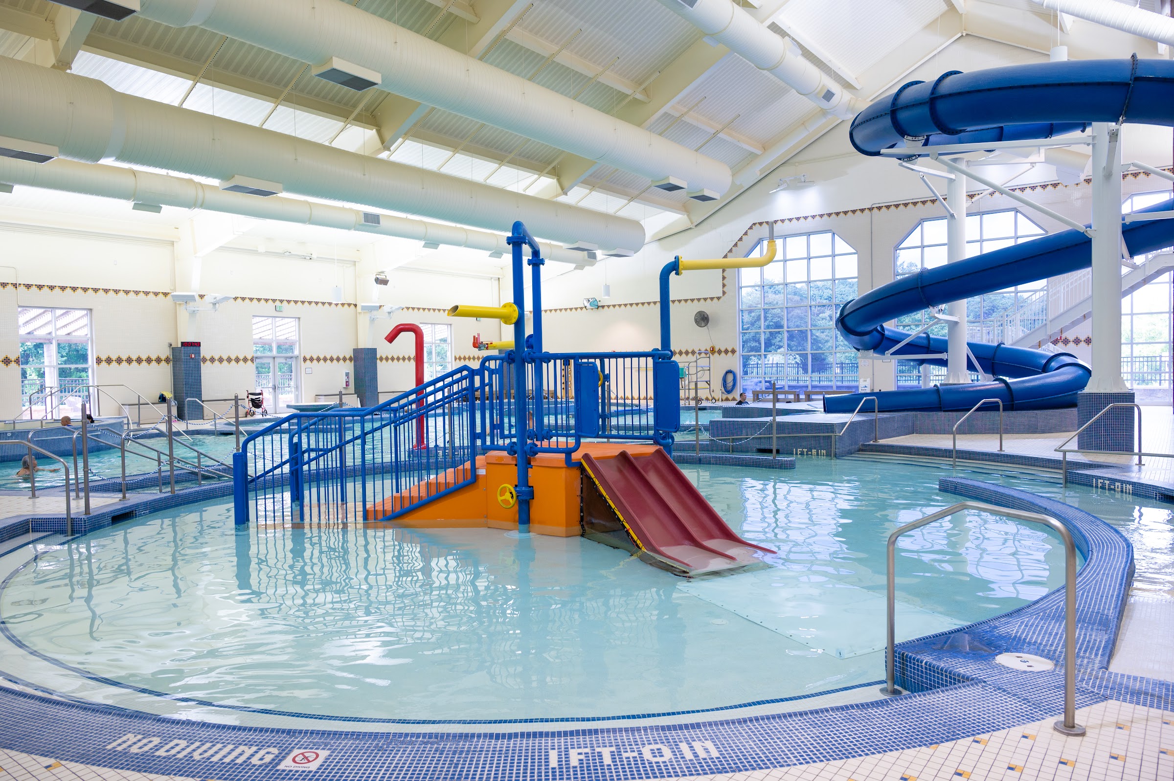 Such a lovely leisure pool with warmer water, lazy river, whirlpool, spa and baby pool with a slide. Finally, if you dare, a very long snake waterside! Great family locker room. Great front desk staff. Lovely deck to sun bask on and eat your snack!