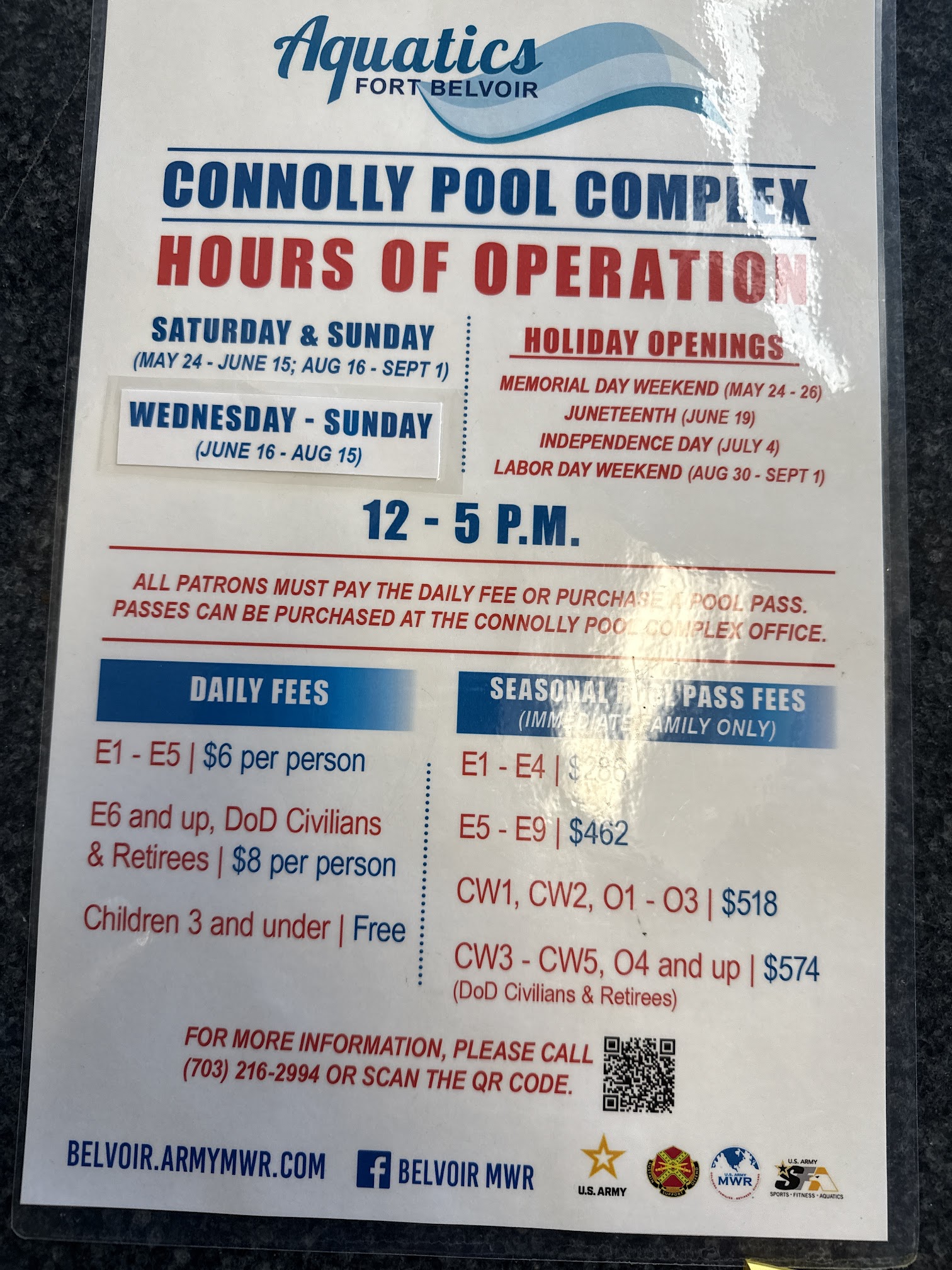 What are people saying (AI review summary)? This military base pool receives mixed but generally positive reviews. Patrons appreciate the well-maintained facilities, clean pools and bathrooms, friendly staff, and the rare inclusion of a diving board. It's considered affordable at $8 per person and offers great views of the Potomac River, along with three separate pools for adults, kids, and lap swimmers. However, common criticisms include limited operating hours, a closed snack shop, and limited, uncomfortable lounge chairs. Access is restricted to military personnel or their guests.