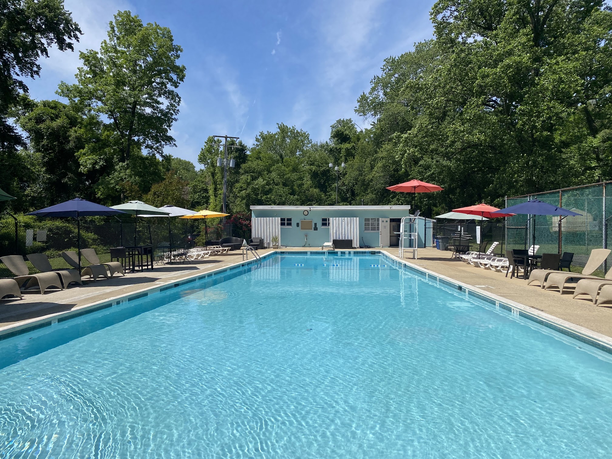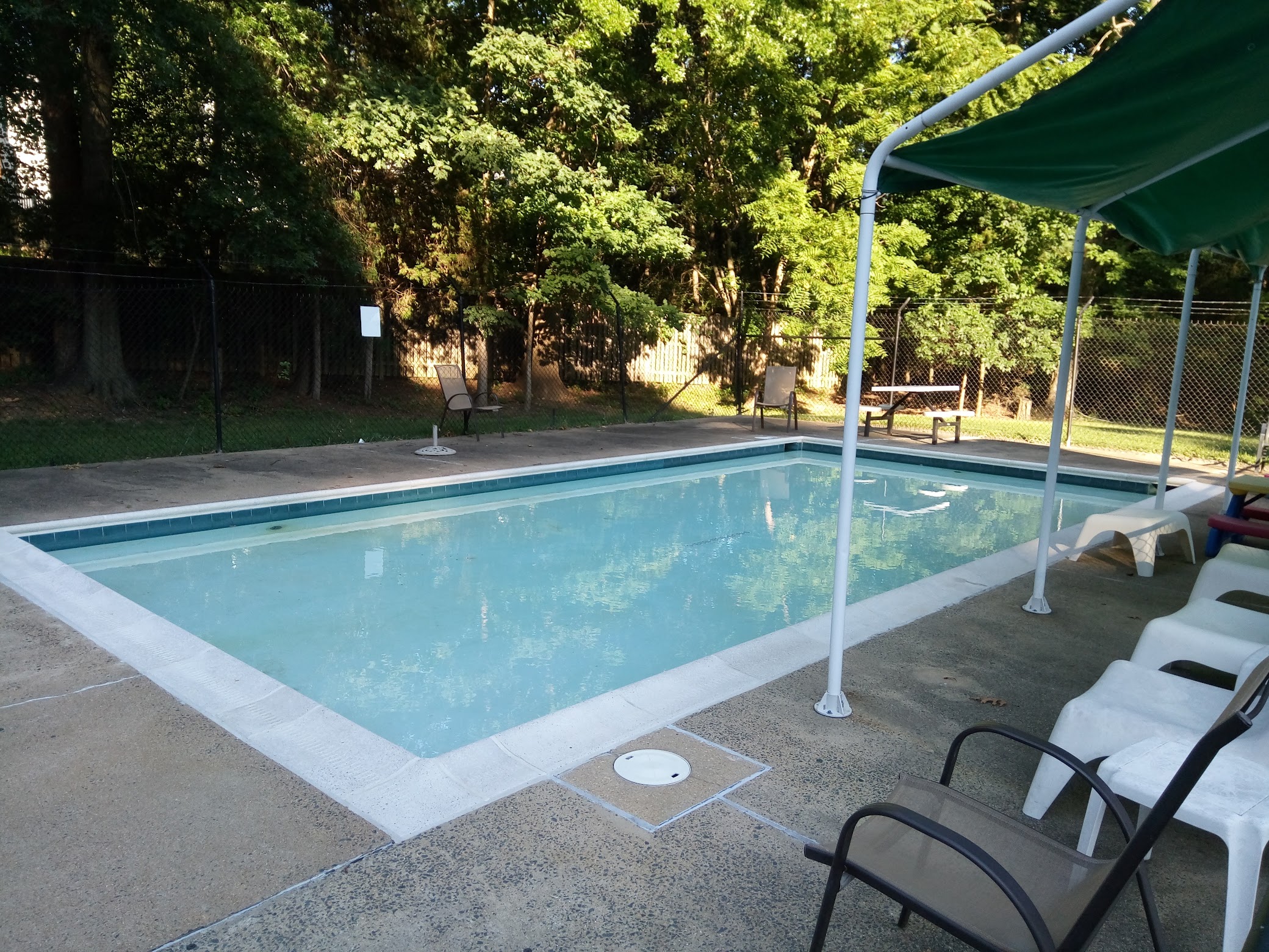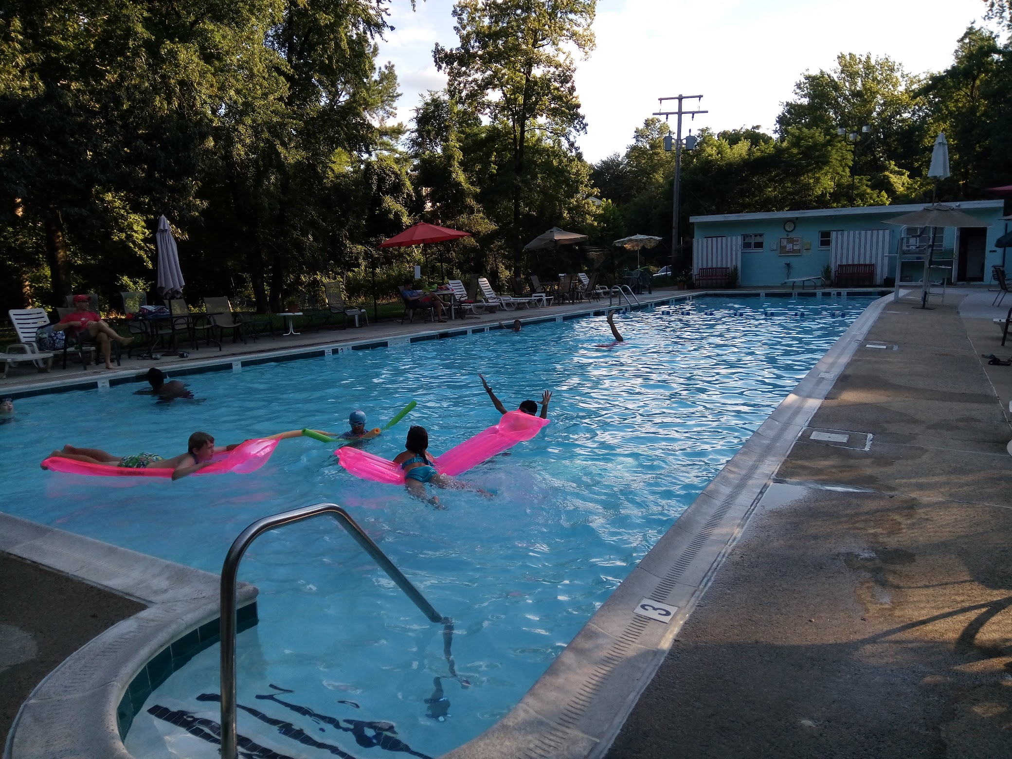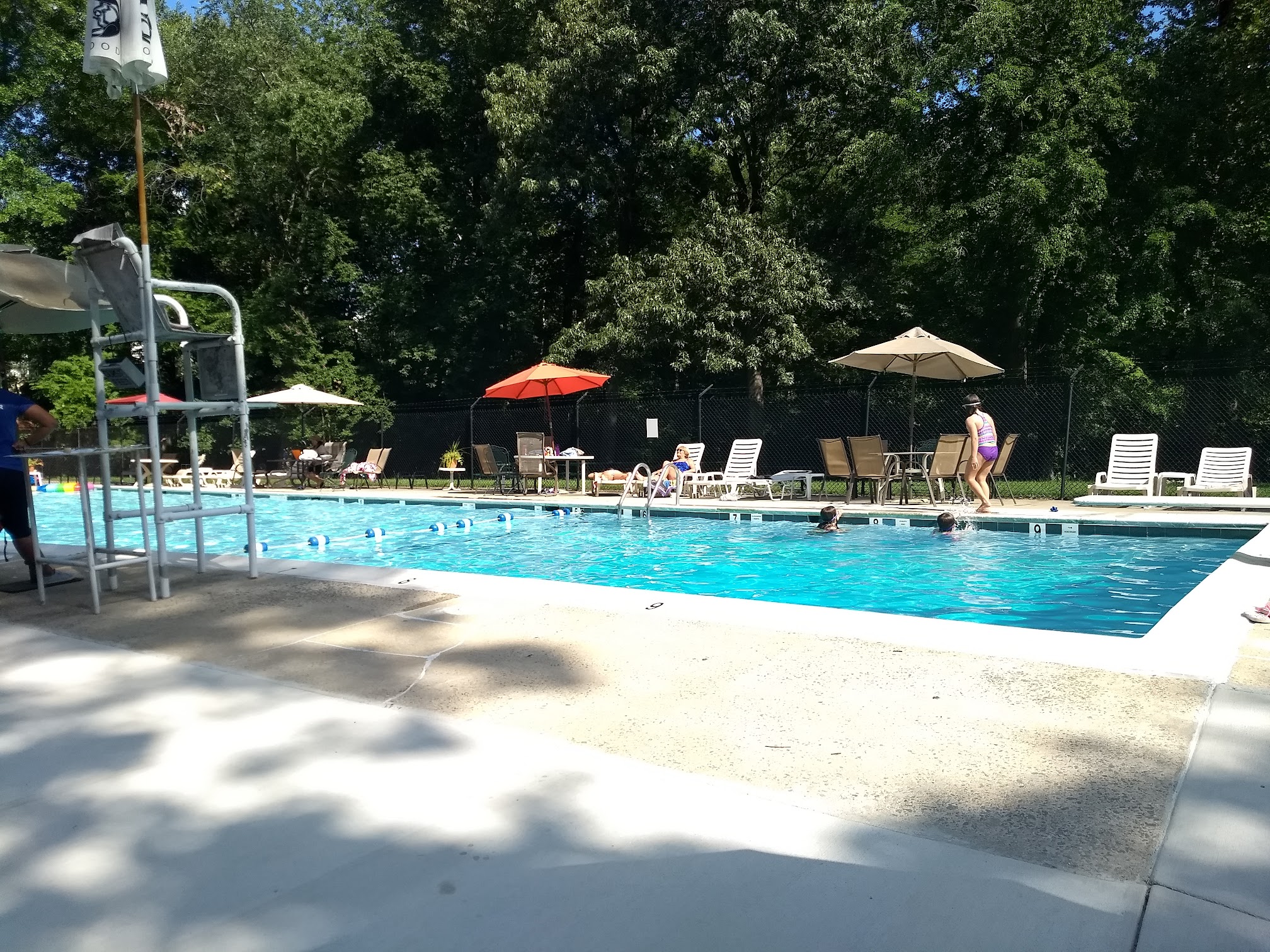 This small community pool has the basics and nothing more, but the low cost of membership and the friendly people earn it 5 stars. There's a wading pool for the kids, a deep end that's actually deep, a diving board and plenty of tables with umbrellas. There's also a full-time life guard on duty, decent showers, and a snack stand with reasonably-priced snacks. It can be a little hard to find, but the secluded nature gives it that "beachy" feel, and the surrounding woods add to the relaxed nature of the place.