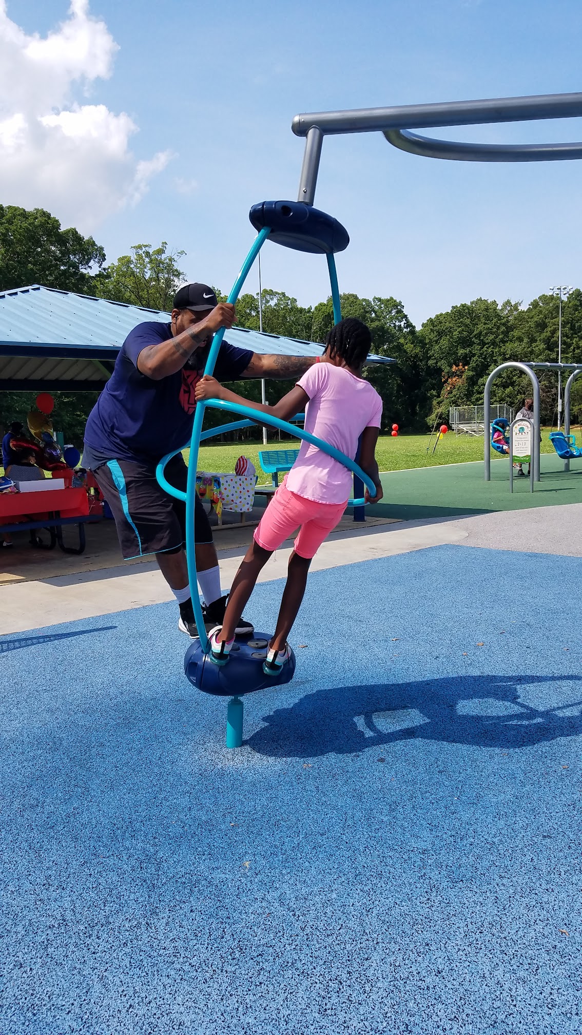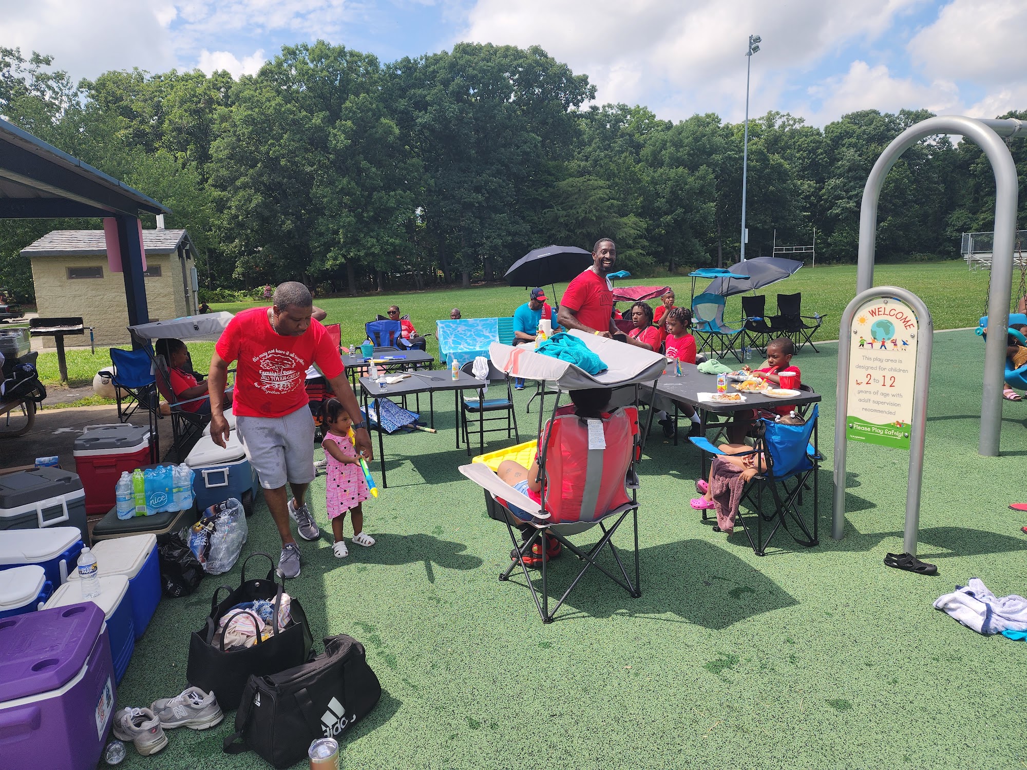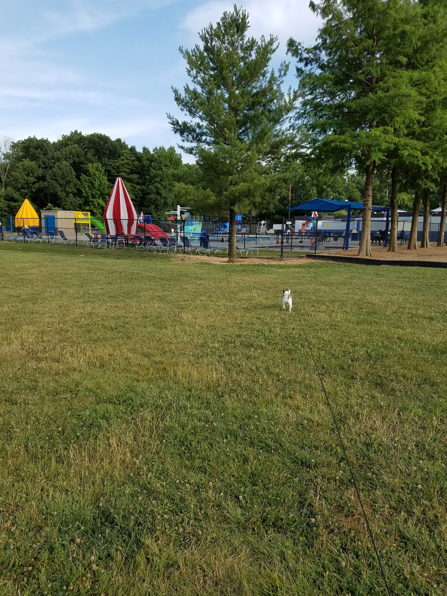 Nice little pool for kids and adults. I mean it's very nice, but Kids have to pass a strict swimming test in order to do anything like go on the green leap pads, green water slide, rock wall or blue water slide. If you do not pass you can only go in chest deep, even with a parent or lifeguard watching. So kids are mostly only on one side, guess that's how its kept so nice🤷♀️ Adults have to pay to get it but can also swim so why not?! There are like 5 life guards always on duty. To watch all the sections of the pool even if no one is swimming in it. They do not have or provide life jackets. There are mandatory breaks where kids have to get out of the pool for about 15 mins so the lifeguards can swim. There's a bathroom and showers. There is no reentry if you leave you have to pay to get back in.(they should use the bracket system for this!) They have picnic tables and lawn chairs.