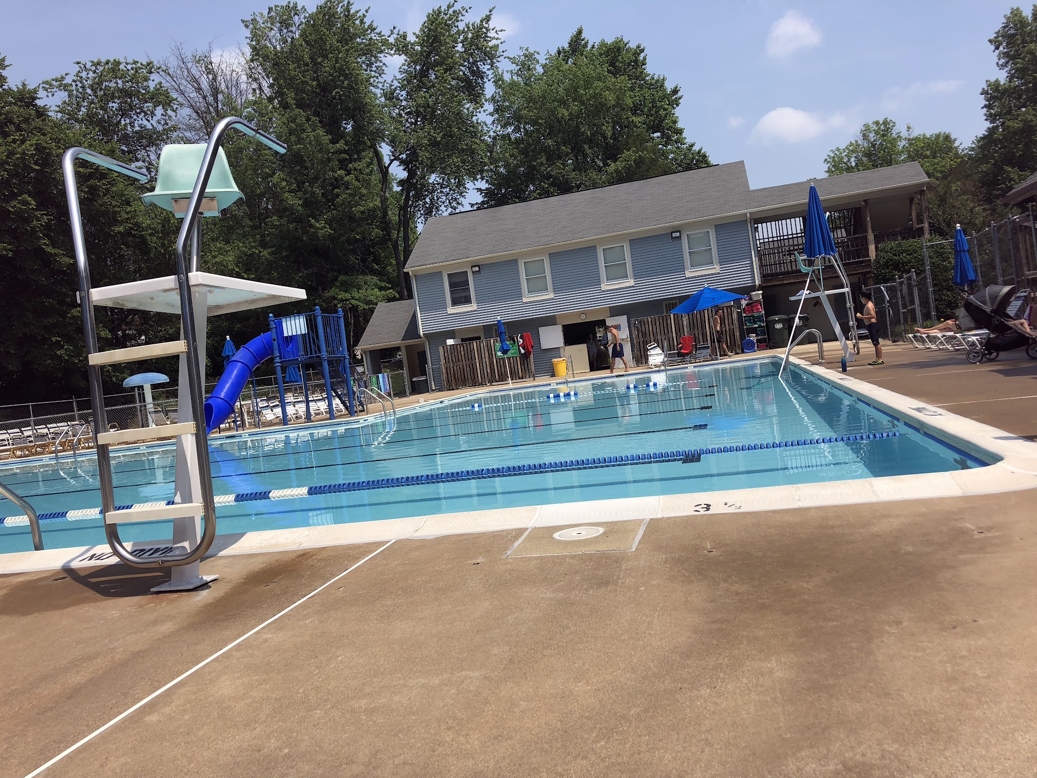 What are people saying (AI review summary)? The reviews describe a well-maintained and 'super' pool with amenities such as a slide, diving section, and plenty of chairs. It is noted for its privacy and ample parking. The surrounding neighborhood is praised as lovely, with polite neighbors, and considered a great place for kids. Users advise caution for learning swimmers in the diving area and mention occasional bugs around the pool. Overall, it's considered a 'very good place' with 'good service'.