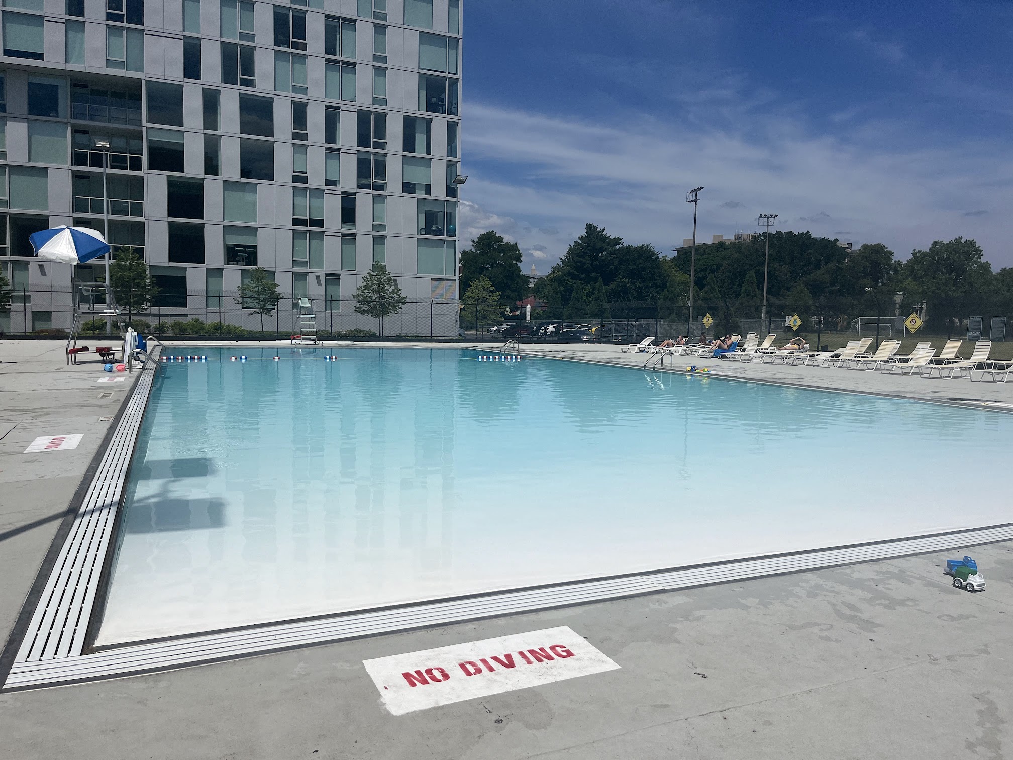 A lovely public outdoor pool in DC that can get very crowded on hot summer days. The pool is not heated, so the water can be quite chilly. The pool is separated into a deep end that goes from 10 feet to 5 feet, along with a shallower wading area. The deep end is where one can do lap swimming, but it's only about 25 yds long and there's a lot of people around and no designated lane lines. What is great about this pool is that they have reserved "adult only" swim times where children aren't allowed. The pool has lifeguards, clean and spacious changing rooms with curtained showers, although the water is scalding hot and one needs to pull a lever for water to flow, and plenty of lawn chairs for sunbathing. After 3 PM, the nearby building does overshadow the deep end
