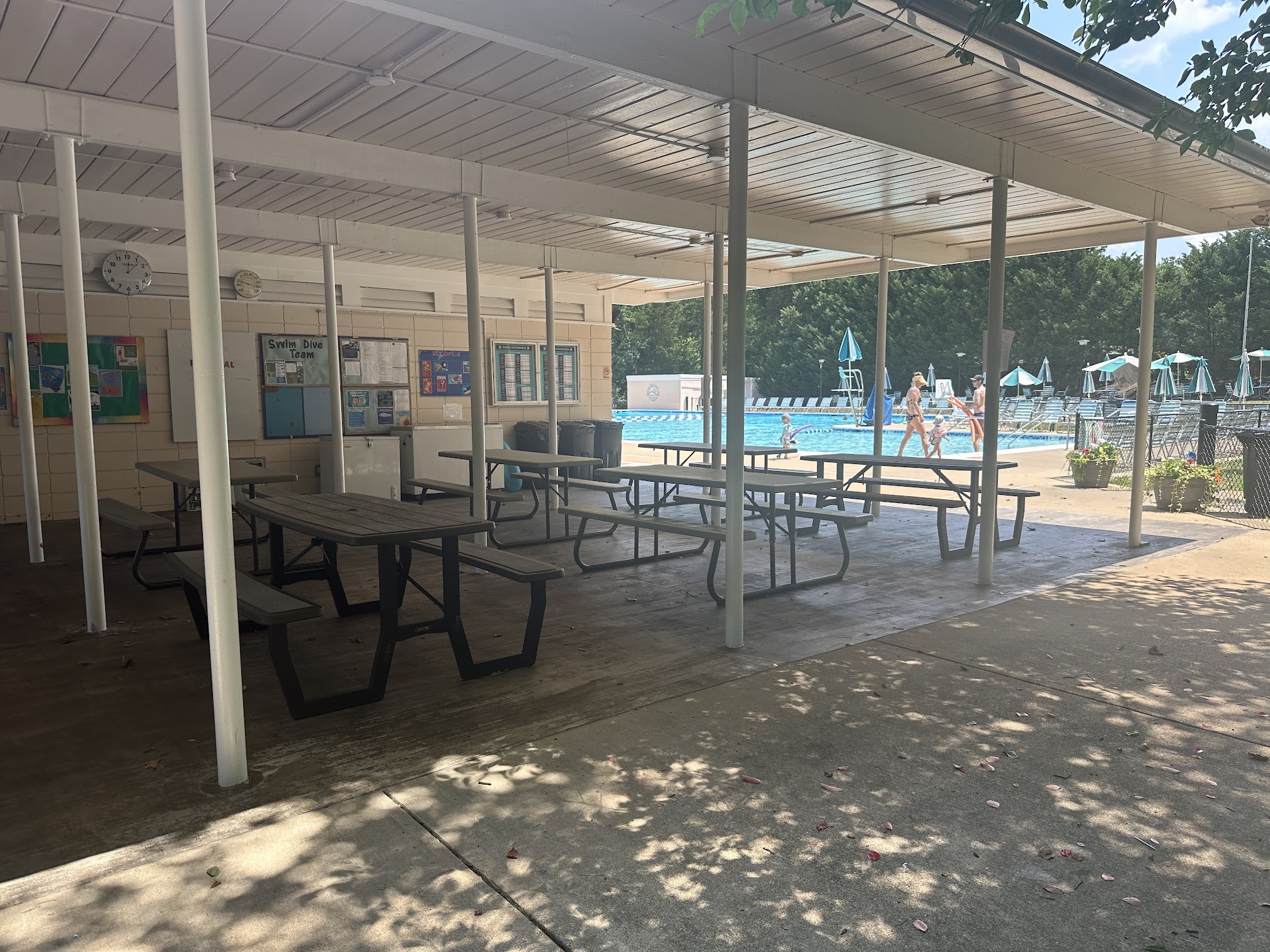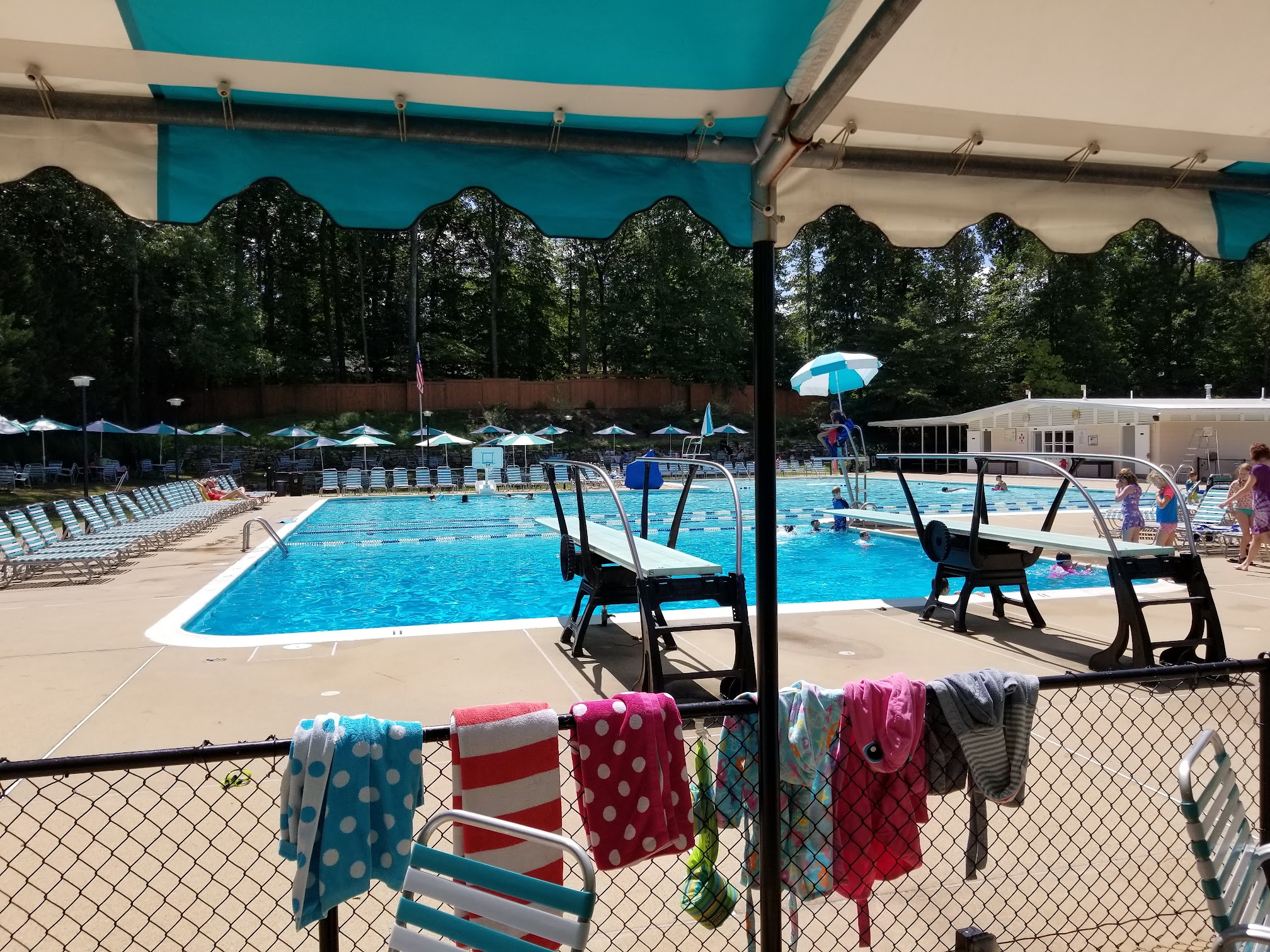 Wonderful pool. It has a covered patio, a grassy lawn. The baby pool has a new shade canopy. There are 2 one meter diving boards in the diving well and the pool is large. It is also a great community of people who belong. I recommend it.