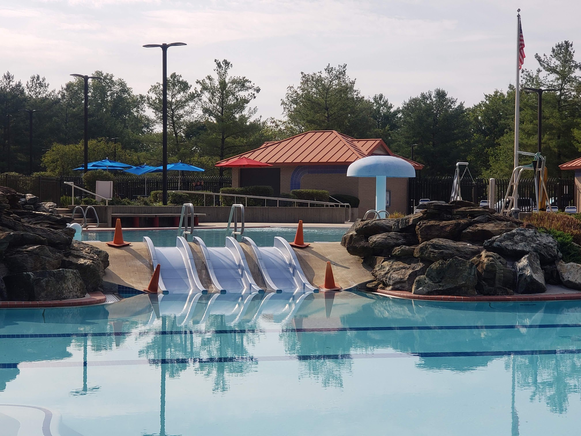 3 great pools with slides and a diving board a splash pad and a playground. Plenty of room to sit, tables with umbrellas and a grassy area too. This pool is worth the drive. Will definitely be back!