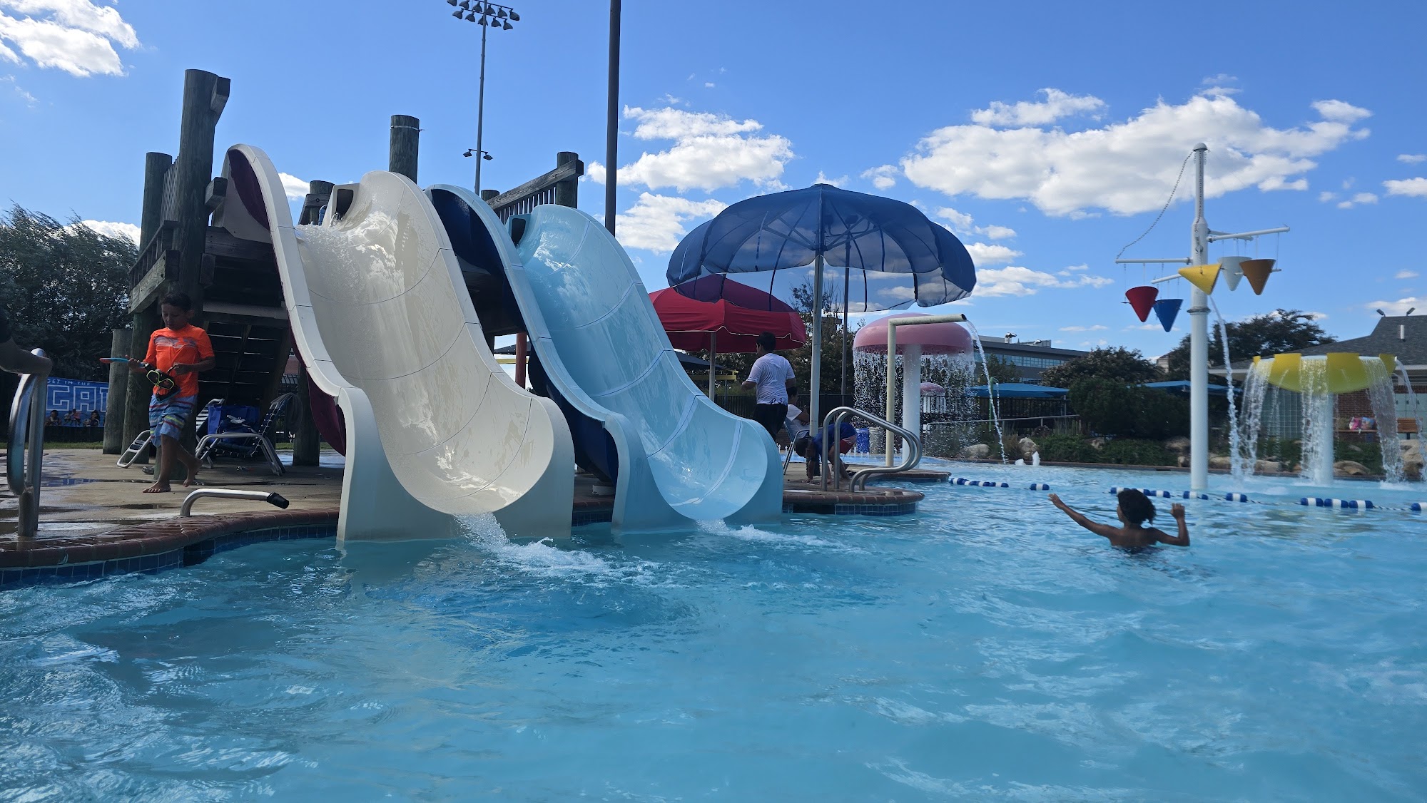 What are people saying (AI review summary)? Reviews for the pool are mixed but lean positive, especially for families. Many highlight the excellent facilities, including a wide array of slides (big, small, and varied in difficulty), multiple pools of different depths (including deep areas for diving), two diving boards, and specific kid-friendly activities like 'gator crossing.' Reviewers appreciate its affordability, convenience, and the option to bring in outside food/drinks, along with ample shaded seating. However, significant negative feedback points to poor maintenance and cleanliness, with complaints about broken, dirty, or non-functional chairs, visibly dirty slides, and dilapidated equipment (e.g., broken lifeguard umbrellas, rotting benches), particularly concerning for an opening weekend. Operational issues like an unpopular 30-minute 'safety break' and inconsistent enforcement in lap lanes (making it unsuitable for serious lap swimming) were also mentioned. Despite these issues, many families and children had a great time and expressed a desire to return.