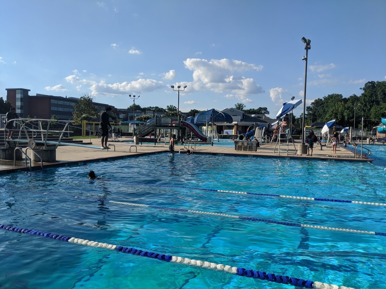 Great facilities for family swimming : big and small slides, two diving boards, several pools of different depths, and lots of seating, including shaded areas. What would make it even better : not having a 30-minute "safety break". When everyone has to get out of the pool and keeping all play areas open (as one obstacle course was closed today, not sure why).