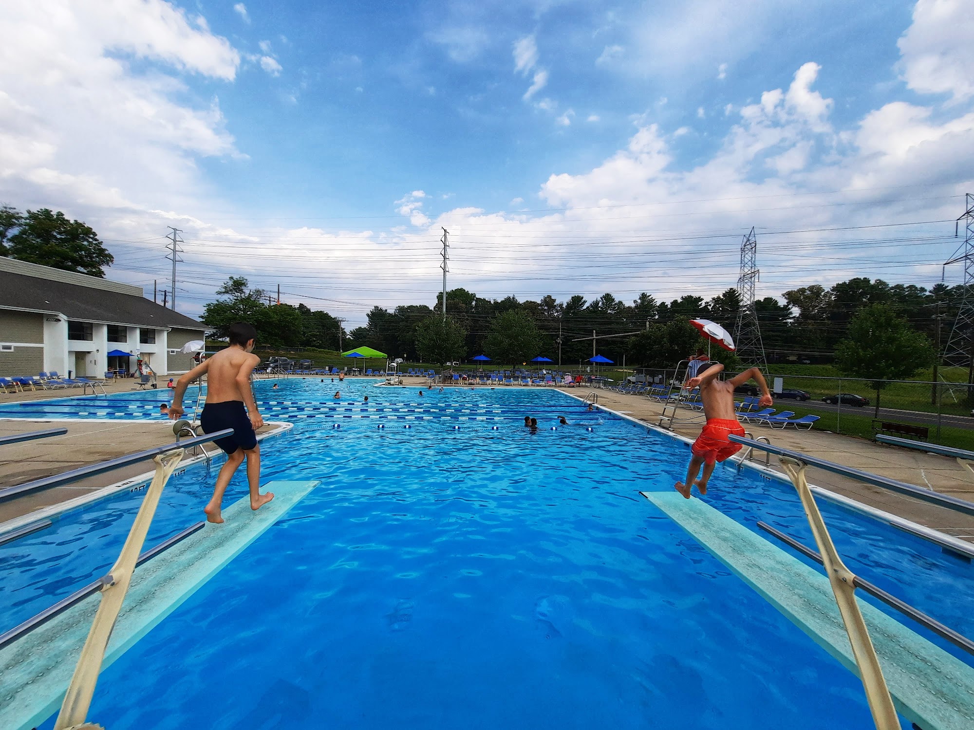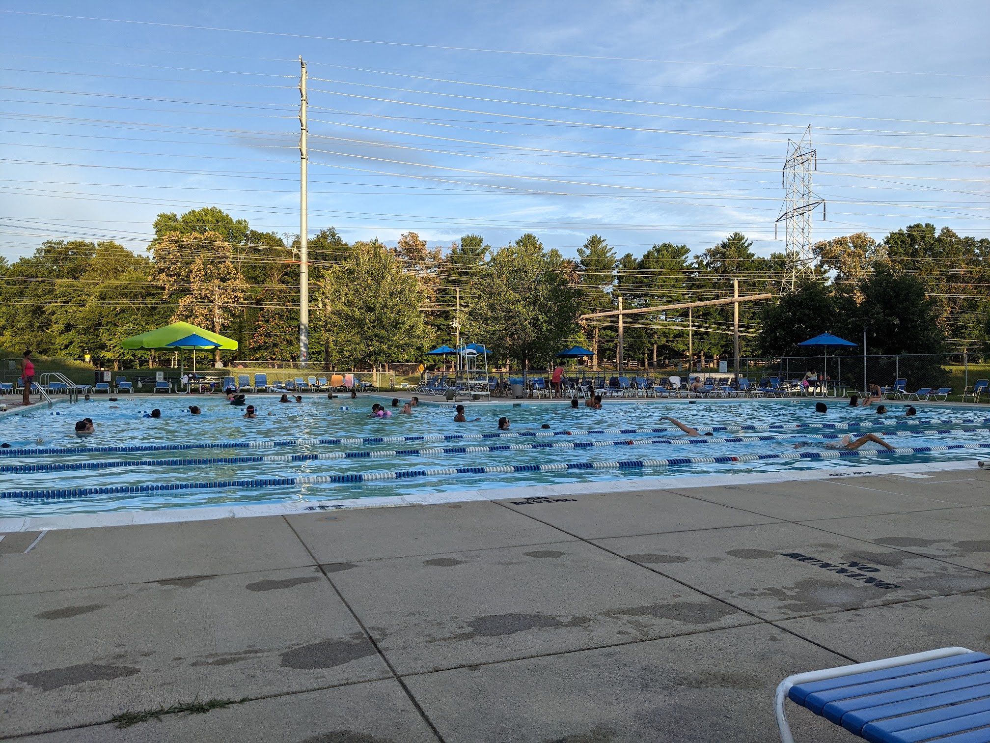 This pool is moderately but consistently heated (so you avoid temperature extremes) and is open earlier in the spring and later in the fall than other pools. You'll need your current Montgomery Village pool pass or a resident's guest pass to enter. The pool isn't fancy. It's divided into three sections, with a shallow end for kids, a center section for swimming (including lap lanes) and Marco Polo, and a diving well. Tots have their own fenced-in wading pool. Adults of all ages and kids usually mix easily, though when school's out sometimes it gets crowded. There's a small cabana for shade, a picnic area with 4-5 tables and lots of grass for blanket picnics, and old restrooms with communal showers. (Wear flipflops--the floor gets grungy.) The sun deck is well-stocked with chairs and lounges. If you're bringing kids, aim to arrive at a quarter after when the kid rest period (that generally begins at the top of the hour) ends. If you're there late at night, keep in mind that the last 30 minutes or so are usually reserved for adult swimmers. The stairs entering from the parking lot are relatively narrow and steep, but there's a stroller and wheelchair-accessible entrance on the access road from the road to the parking lot; just go up to the fence and call for a lifeguard.