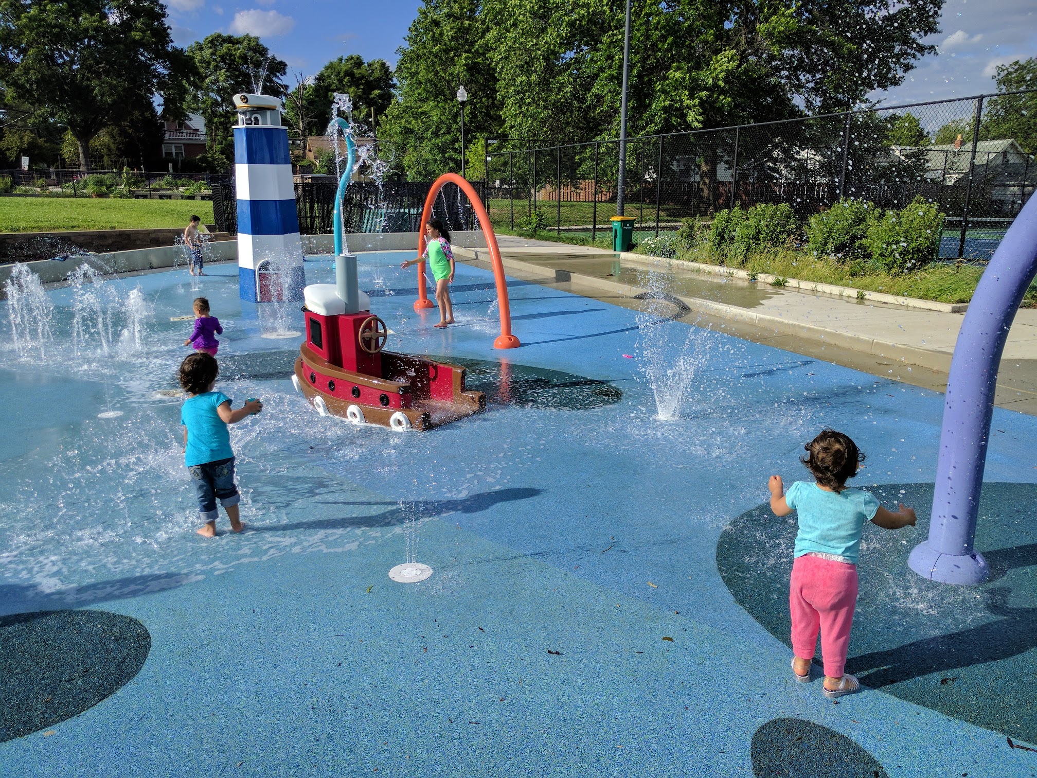 Clean public recreational area featuring a playground, a track, tennis courts and a splash area.