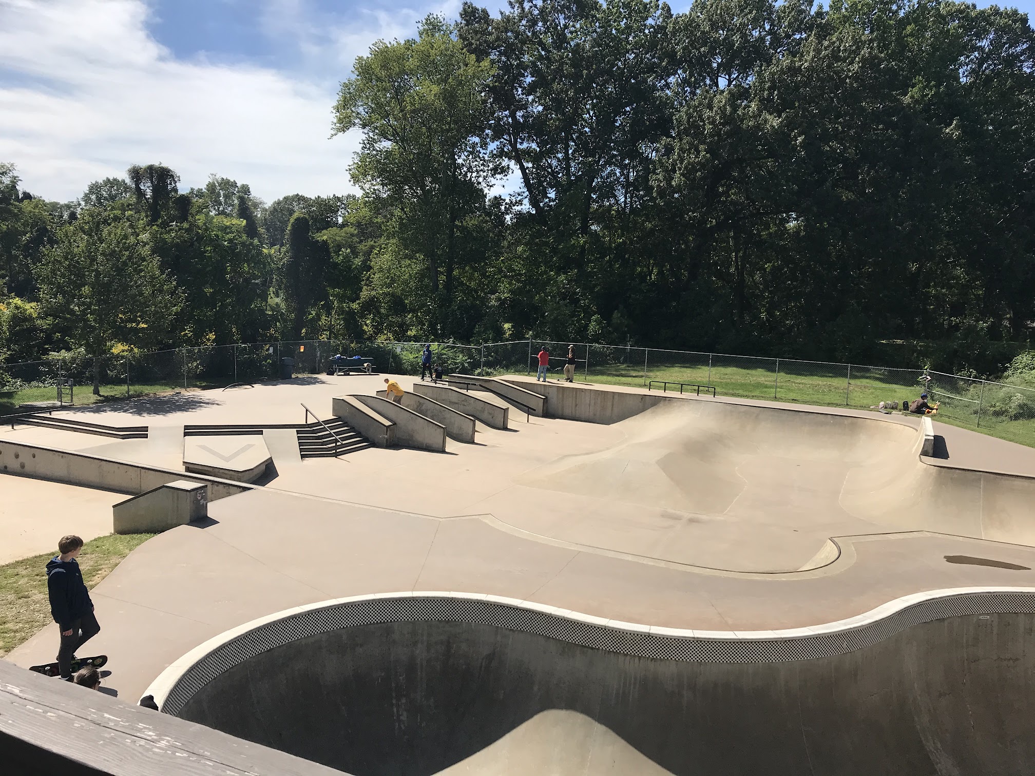 Sprawling outdoor spot featuring a skatepark as well as a swimming pool and playground.