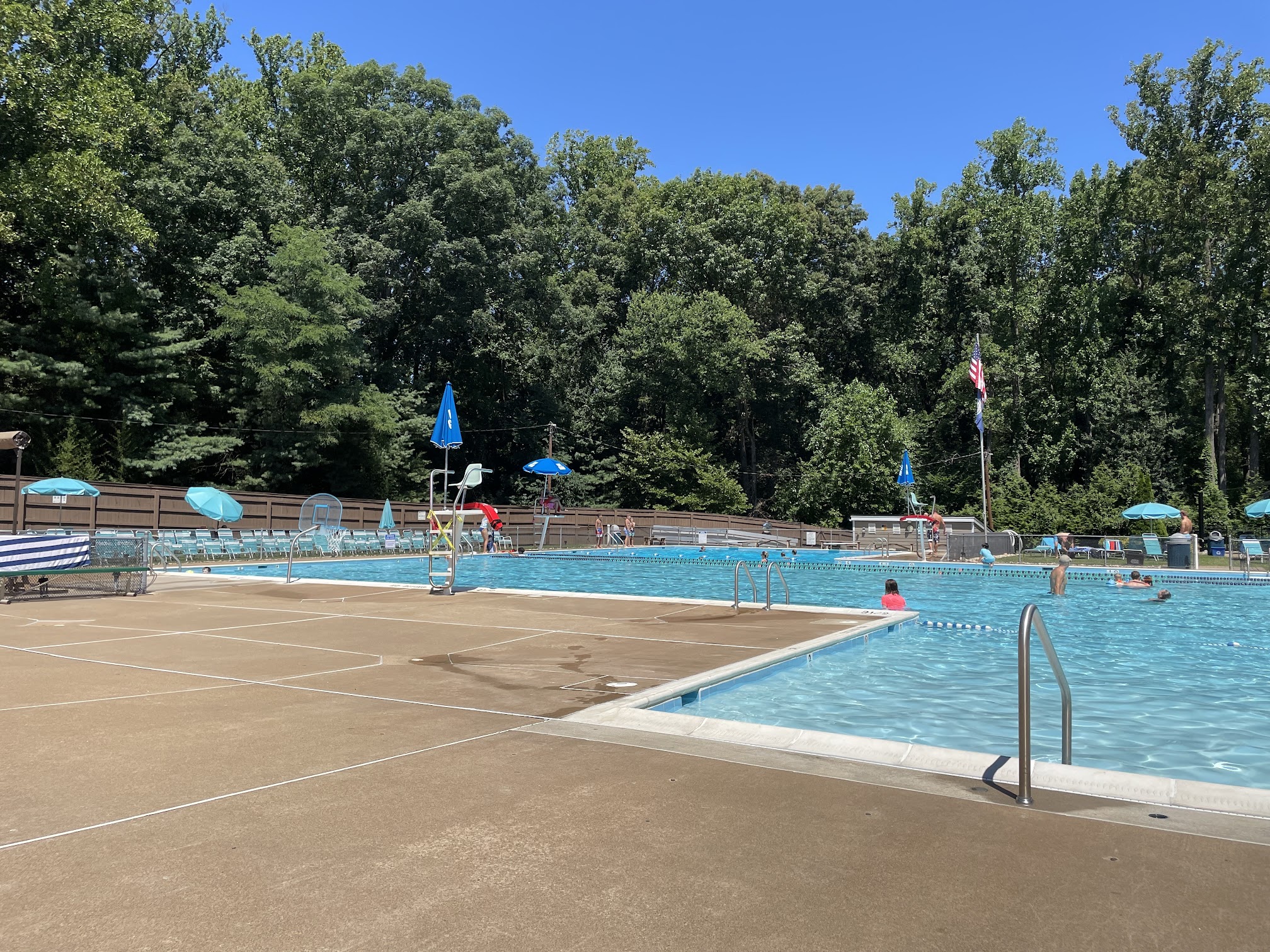 Good sized pool, swimming lanes and diving pool with an area for toddlers. There's also volleyball court and tetherball. There's a long waiting list to join (think years not months) but it's worth it as during the summer months all the neighbors use this pool. Staffed by friendly lifeguards and there's pizza companies that deliver directly to the front desk. Along with grills that are free to use, lots of picnic tables, loungers, chairs and ice cream for break time this is a great setup.