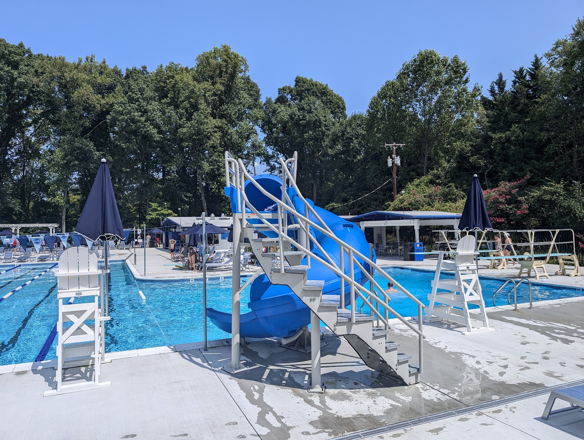 Edit from 2025: these photos are from before the major renovation that took place 2023-2024. In May 2024 it reopened with a new pool, deck, furniture, playground, etc. We enjoy this neighborhood pool. Nice large trees around it provide some shade. It's great seeing people from the neighborhood there. It's a members only club, but guests can come with a member for a fee. GPS sometimes doesn't direct to the correct place, but to a separate adjacent business off Grosvenor Ln.