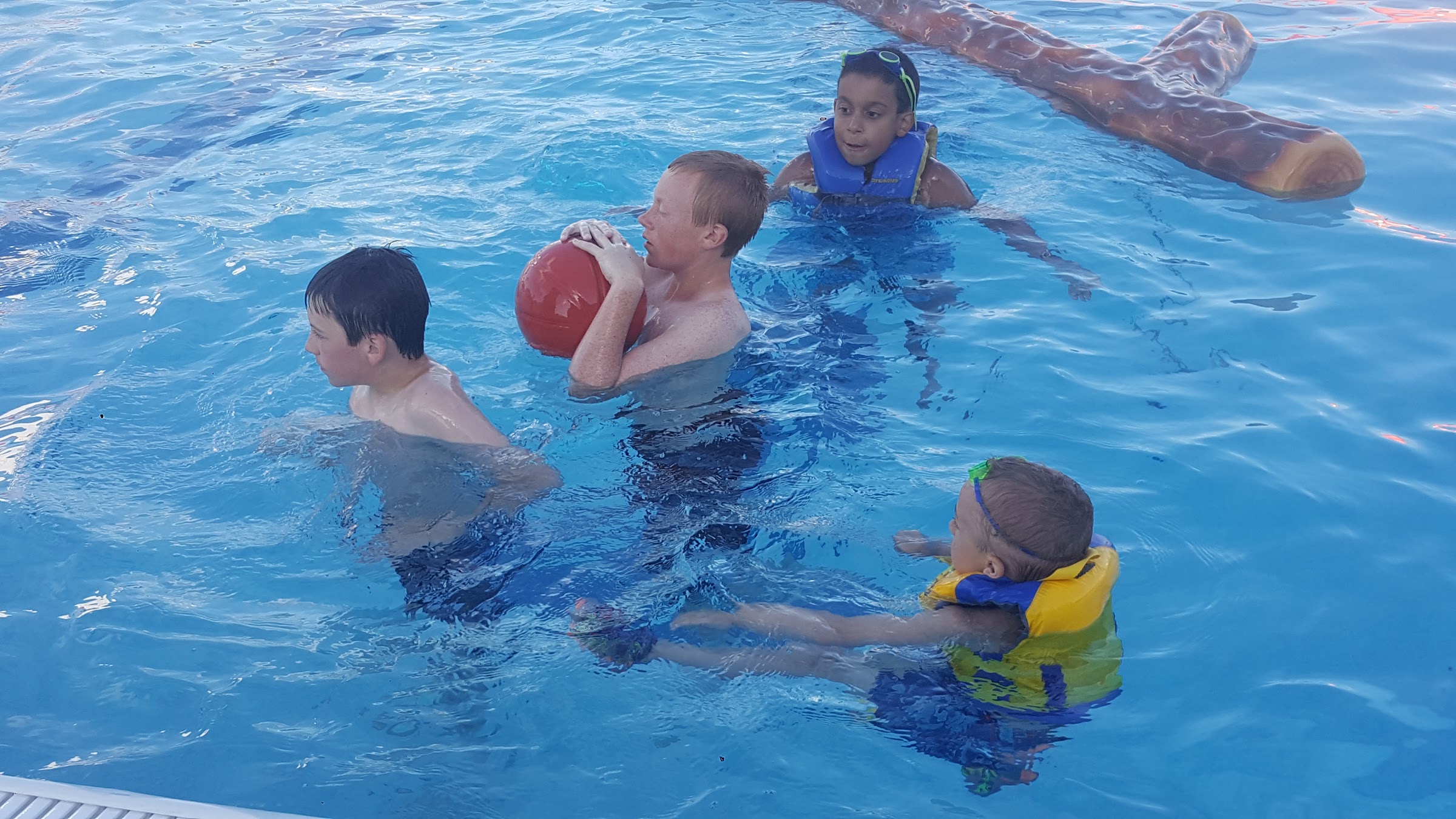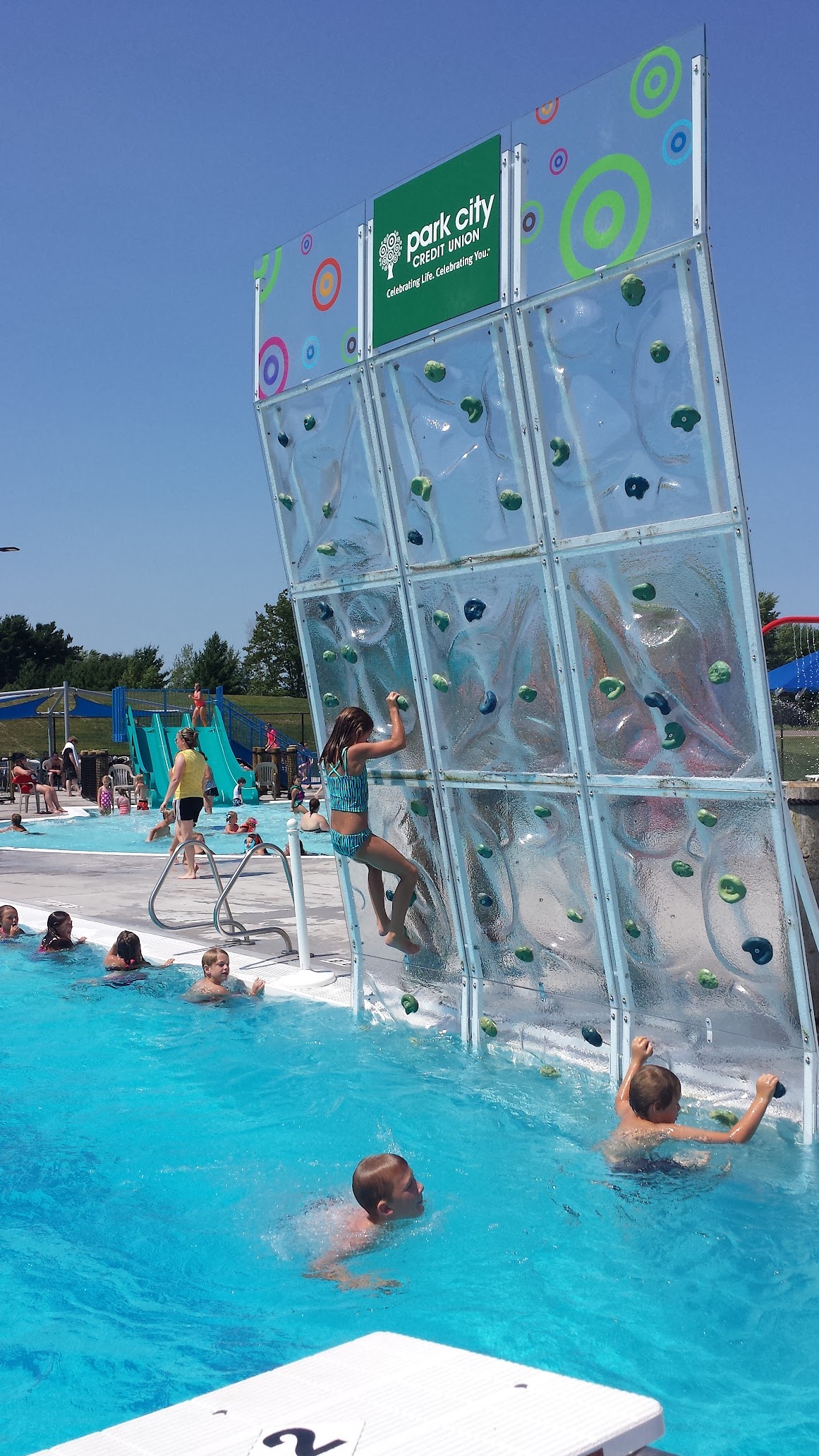 Public pool offering slides for kids and a rock-climbing wall, plus lifeguards, clean facilities and friendly staff.