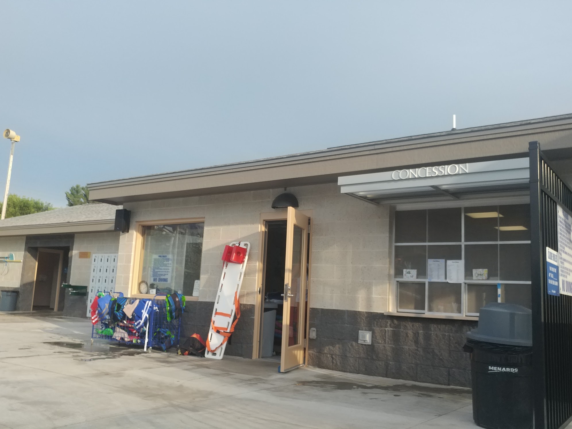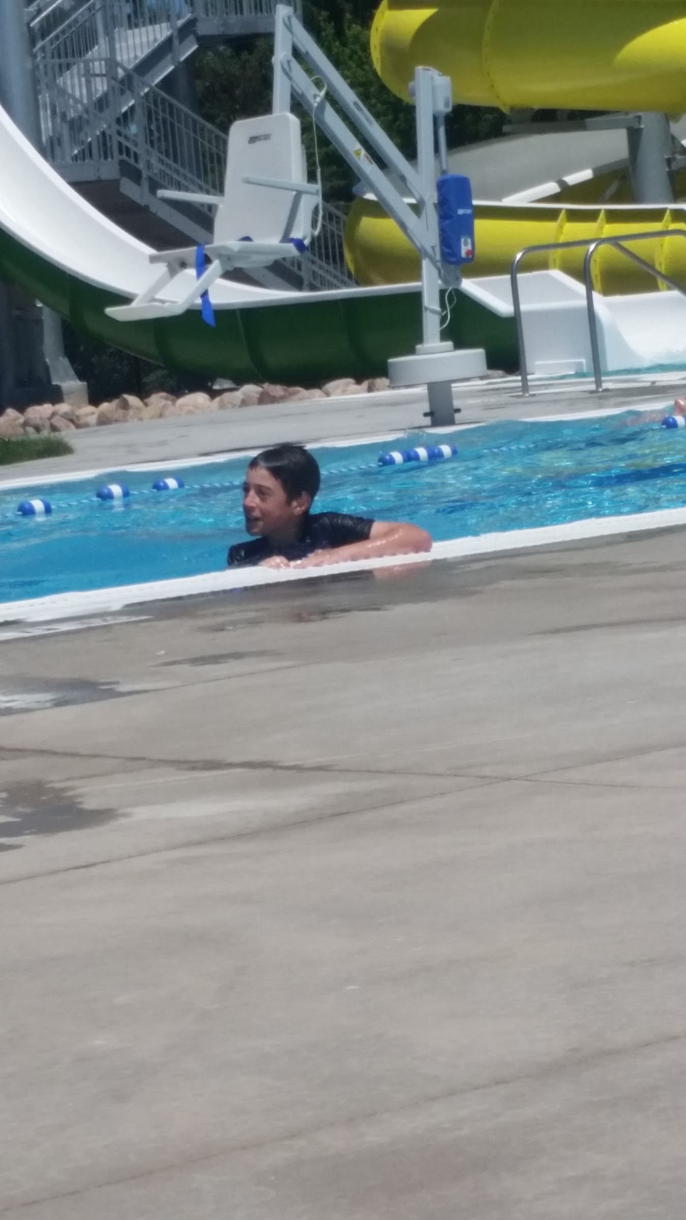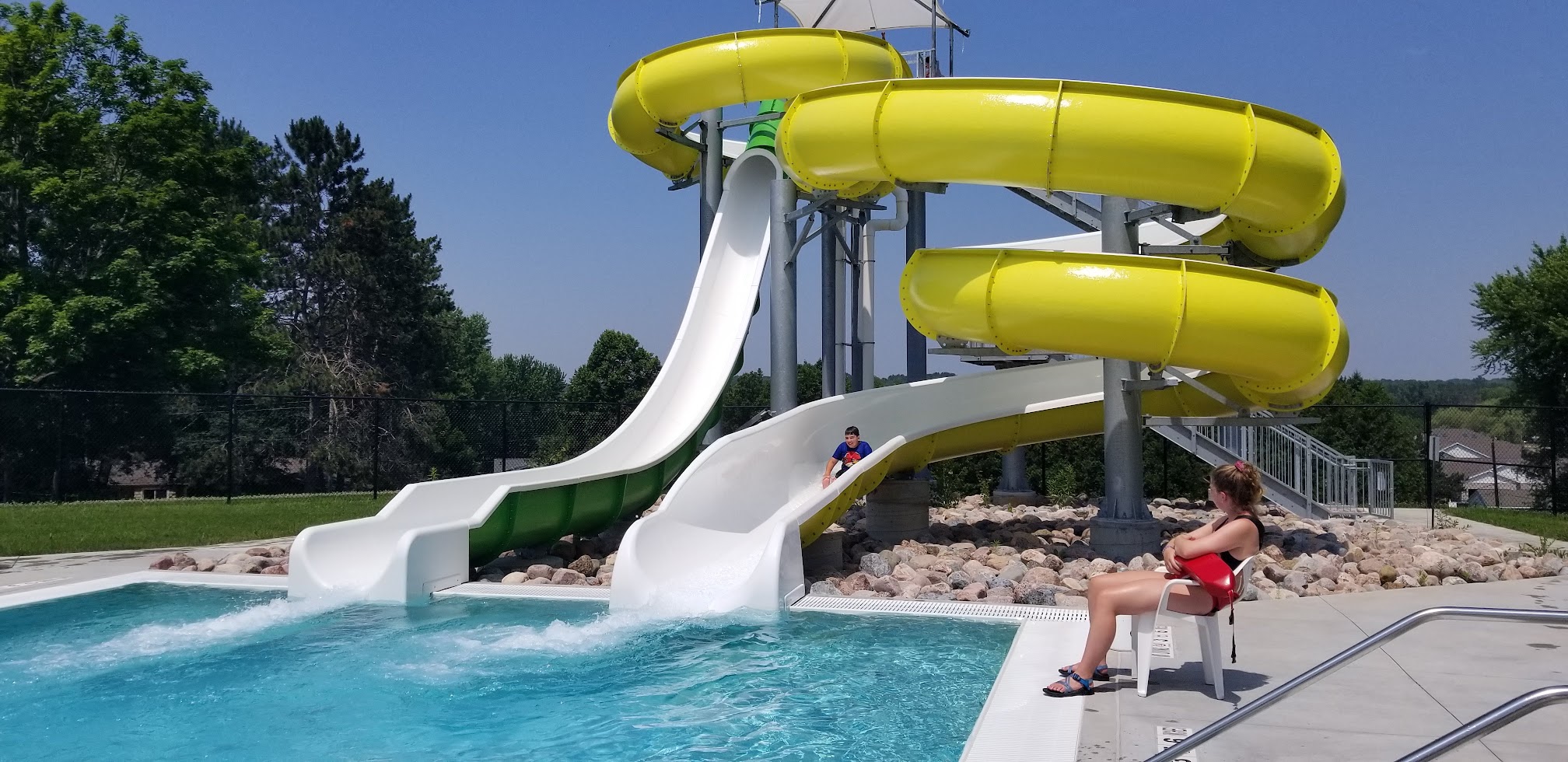 Nice pool. Clean. 2 bigger slides. One fast, one slow. One swimming pool. One kid area. All areas are connected. Many life guards on duty and all are very attentive. Priced very reasonable. Snack bar available.