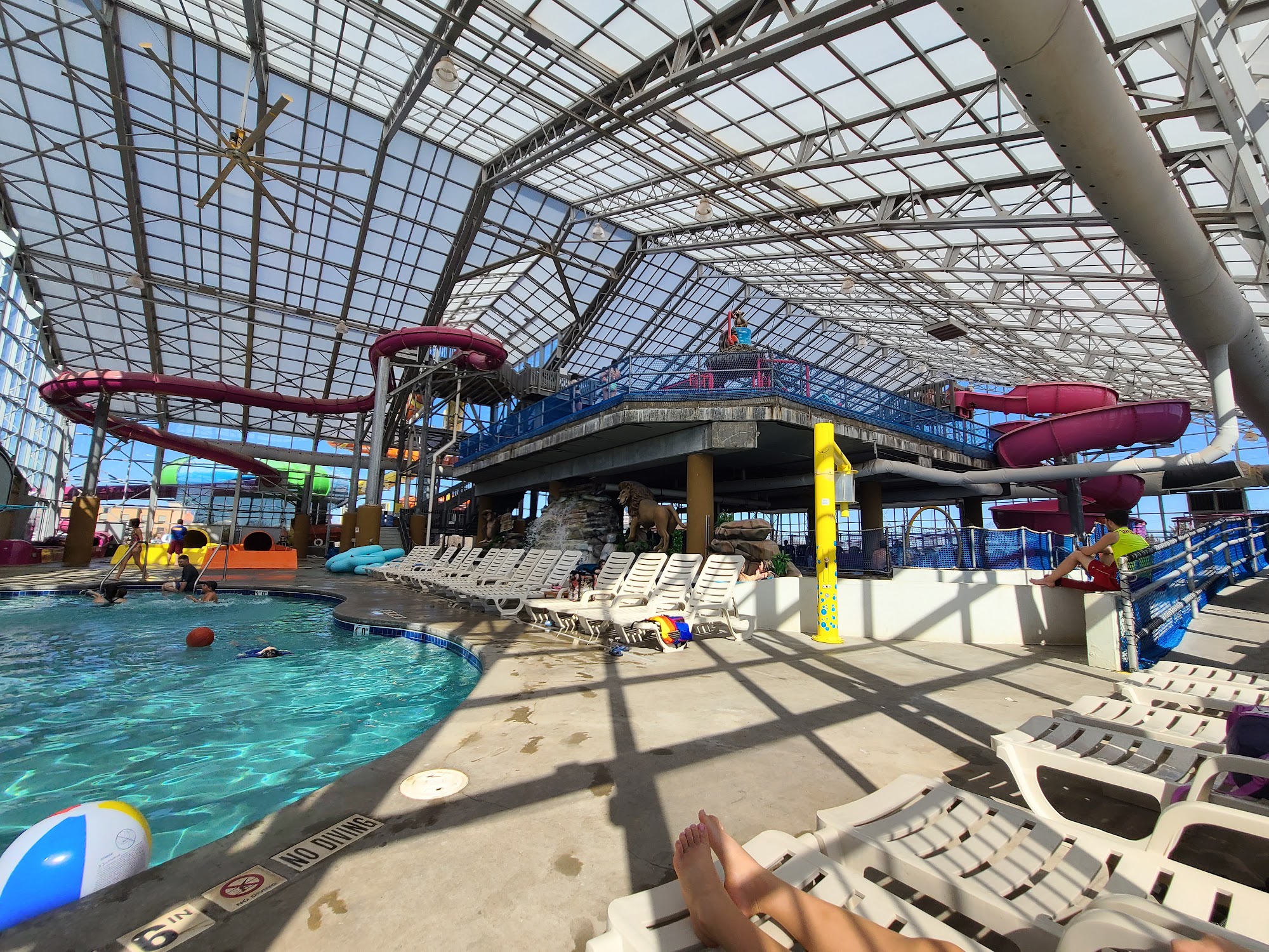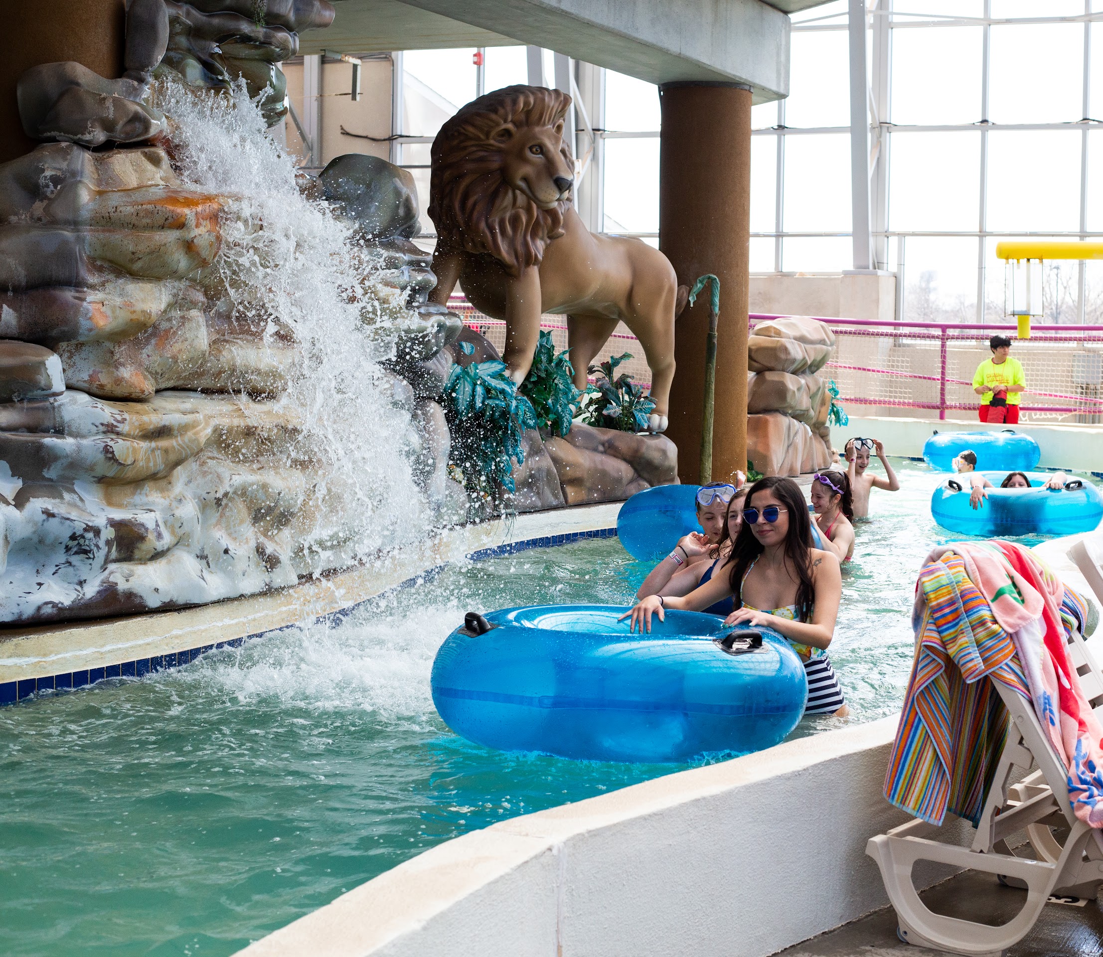 Indoor, family-friendly water park featuring slides, a lazy river and a wave pool.