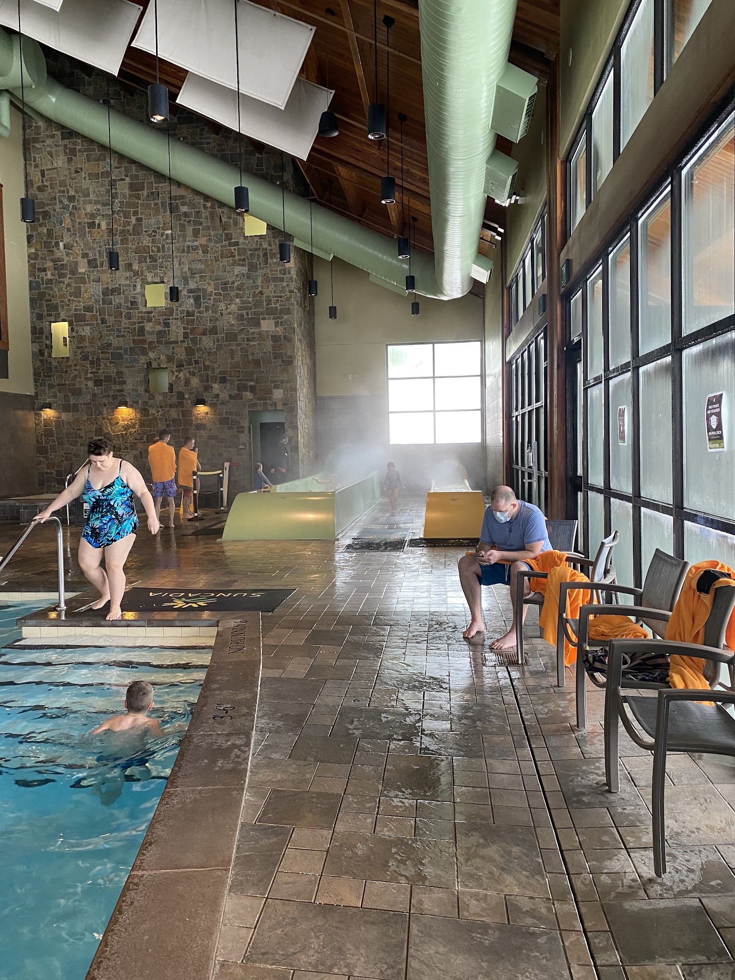 We really enjoy swimming here. Currently during the pandemic you need reservations. I highly recommend when you book your stay you find out when the reservation window opens. Because they book up pretty quick, I’m talking several minutes and the timeslot that you want will be filled. The outside pool is way warmer than the inside pool just an FYI. Take a towel with you if it’s snowing so you don’t freeze on the walk between inside and outside. Water sides are fun for the kids and adults alike. All in all a great place to spend time with the family no matter what their age.