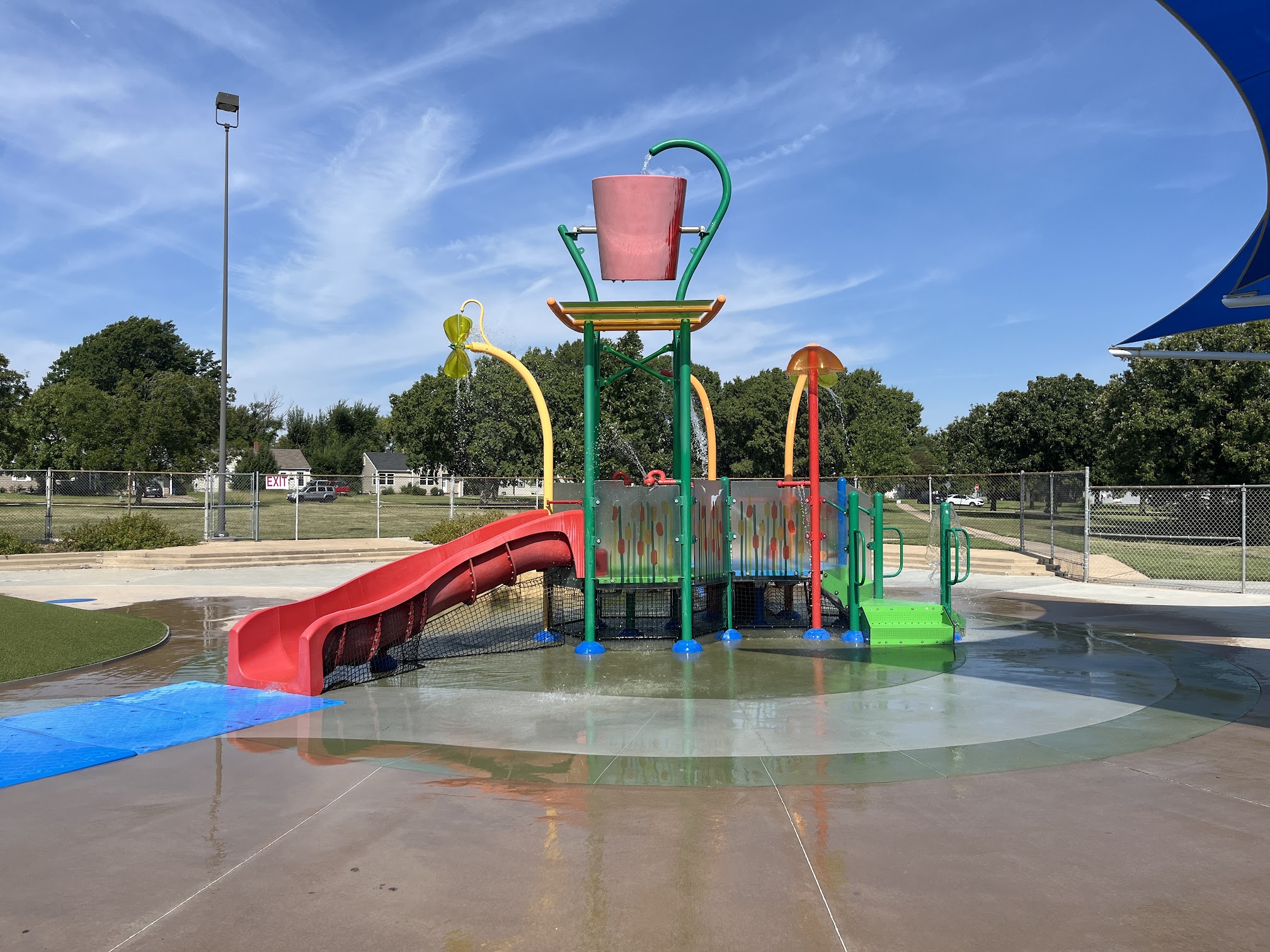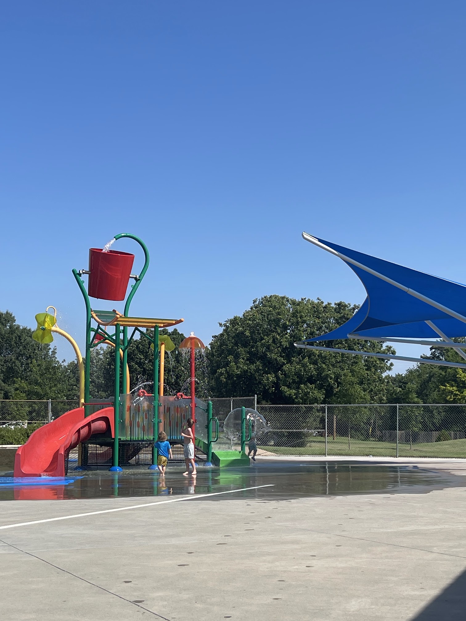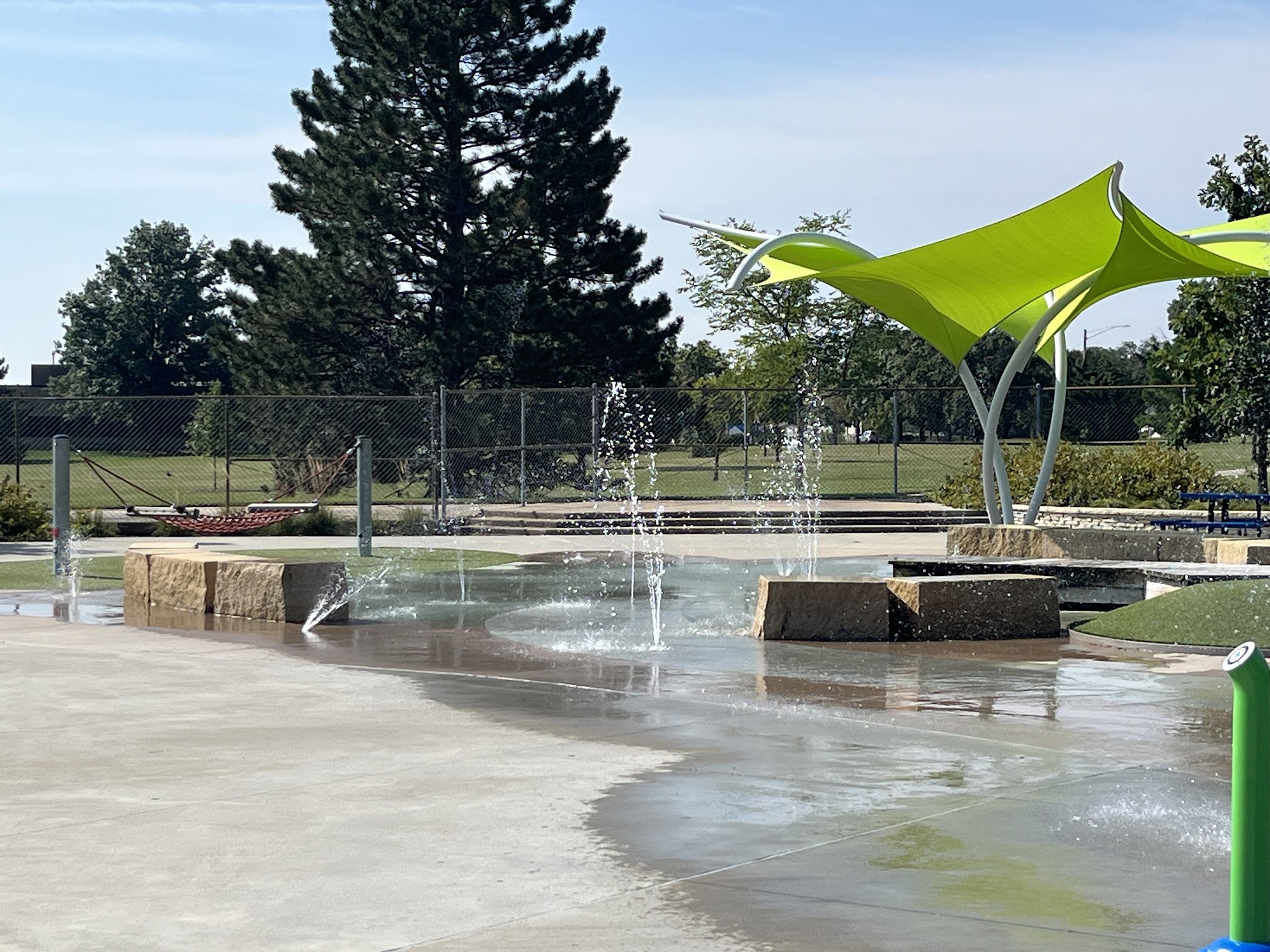 What are people saying (AI review summary)? This is a great, free, city-funded park, particularly noted for its cooling features like fountains and a large bucket dump, making it popular on hot days. It offers plenty of parking and four picnic tables. However, a major recurring issue is the severe lack of shade, with only two shaded tables, which many reviewers find uncomfortable, especially given how busy the park gets. Other drawbacks include non-working water on the slide structure, no restrooms, and a potentially dangerous area near the slides where children frequently fall. Despite these concerns, it is widely considered an awesome place for a free activity, and some hope for more shade as trees grow.