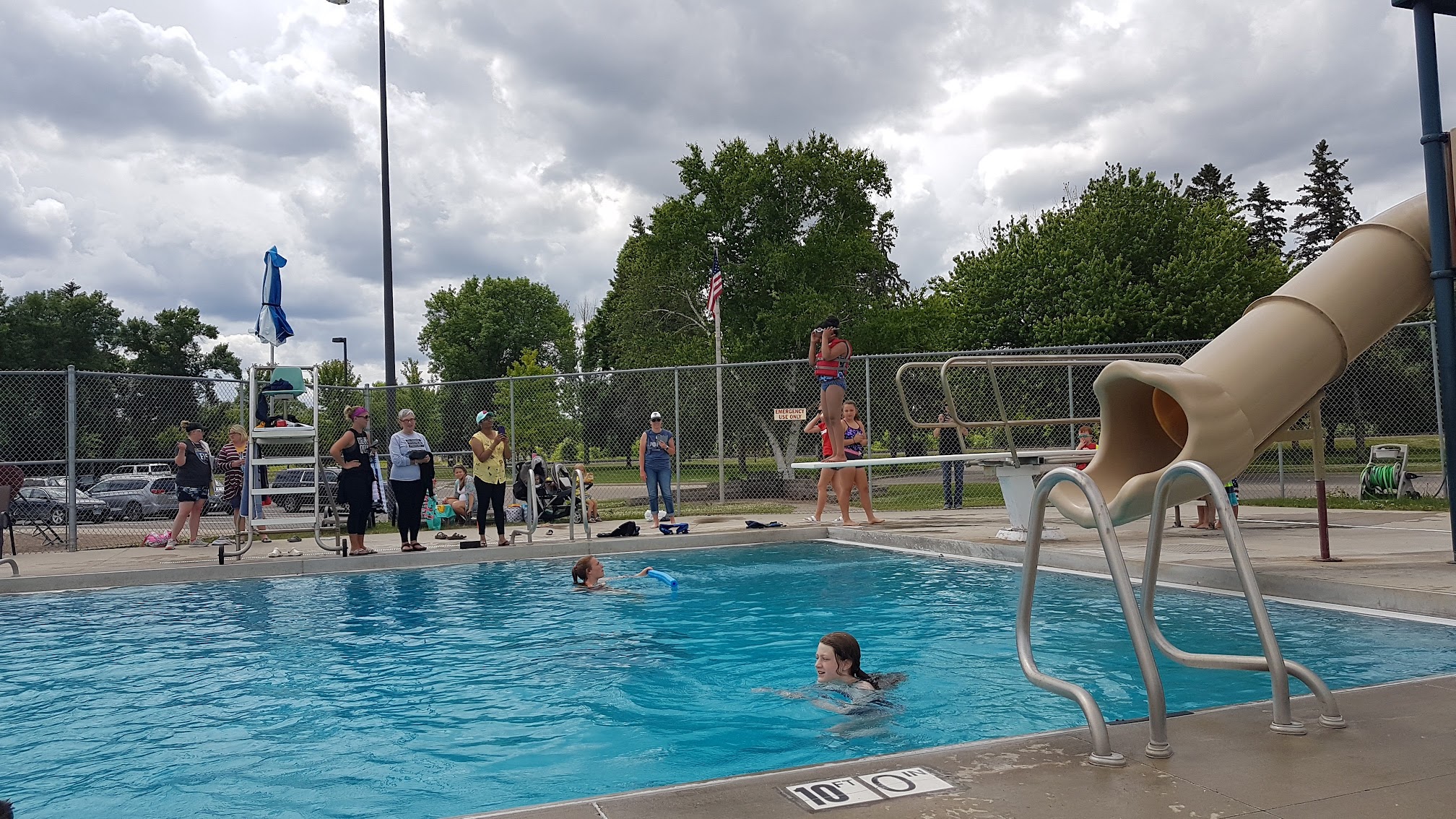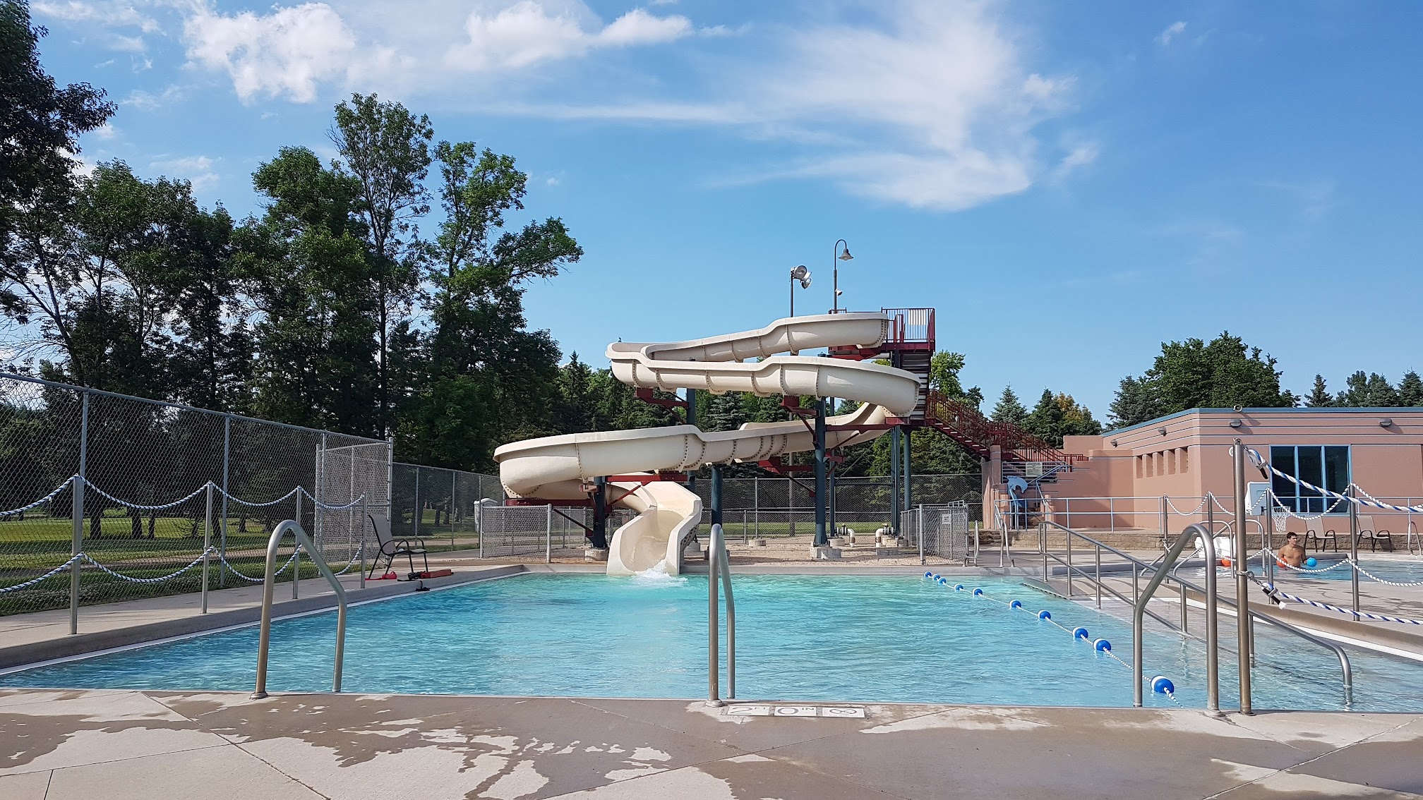 This is a very entertaining pool. Fun for all ages. Large kiddy pool and big pool. Slides, diving boards, water falls, and the water is warm.