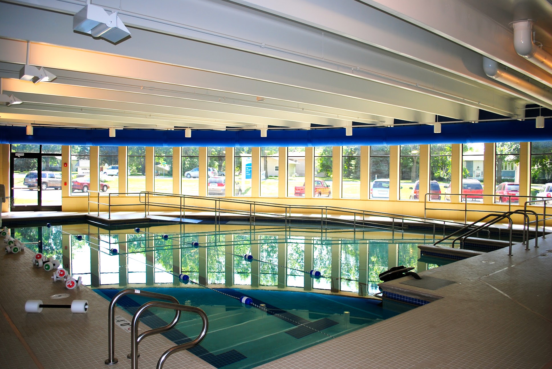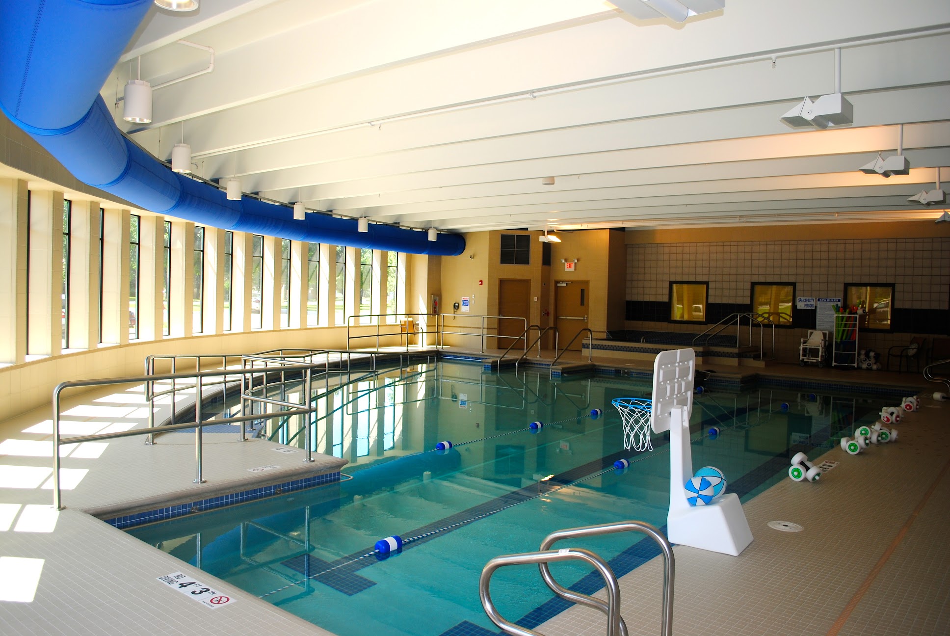 The aquatic center at Club Bethesda Wellness Center features a warm water pool maintained at 92 degrees Fahrenheit, a lap pool kept at 82 degrees Fahrenheit, and a whirlpool heated to 102 degrees Fahrenheit.
