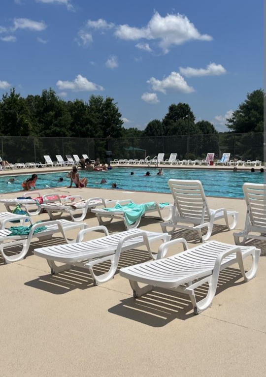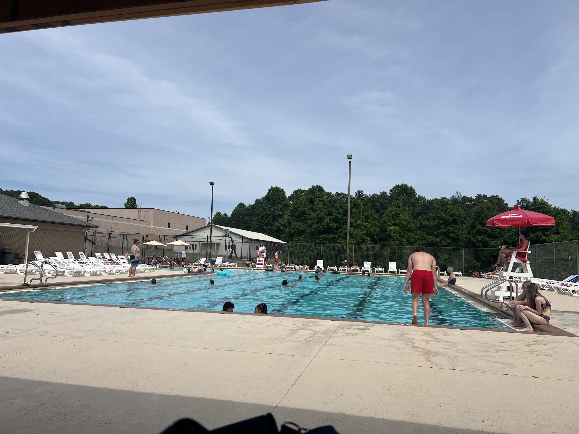 Love this pool! Floats, toys, and food allowed. They also have concessions. 2 lifeguards on duty, swimming lanes are 6ft gradually sloping from 3ft, shallow end, and a kiddie pool. There are umbrella shaded tables as well as lounge chairs.