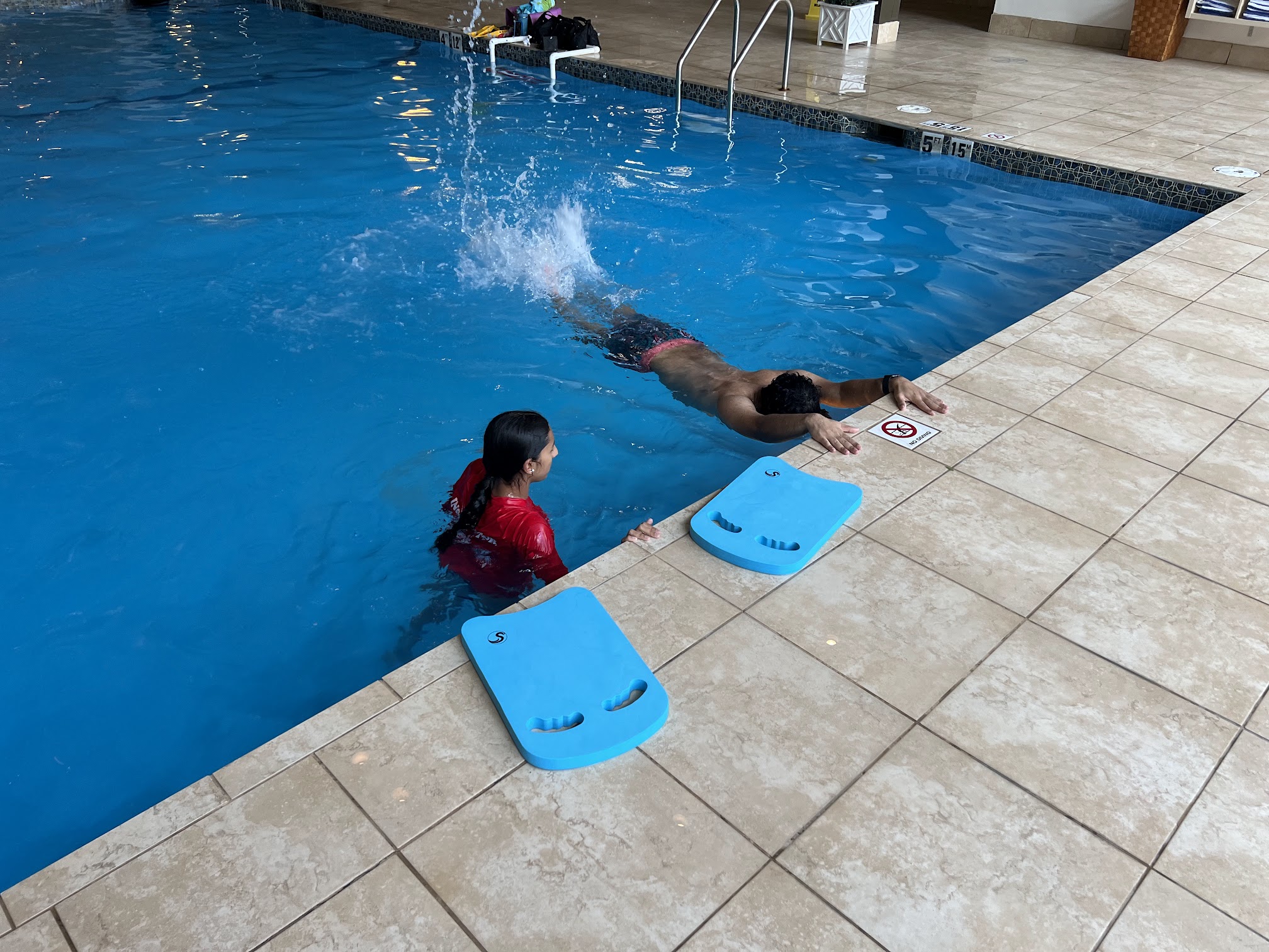 The indoor pool at this location is heated to a comfortable 85-86 degrees Fahrenheit (approximately 29-30 degrees Celsius), providing an ideal warm environment for swim lessons.