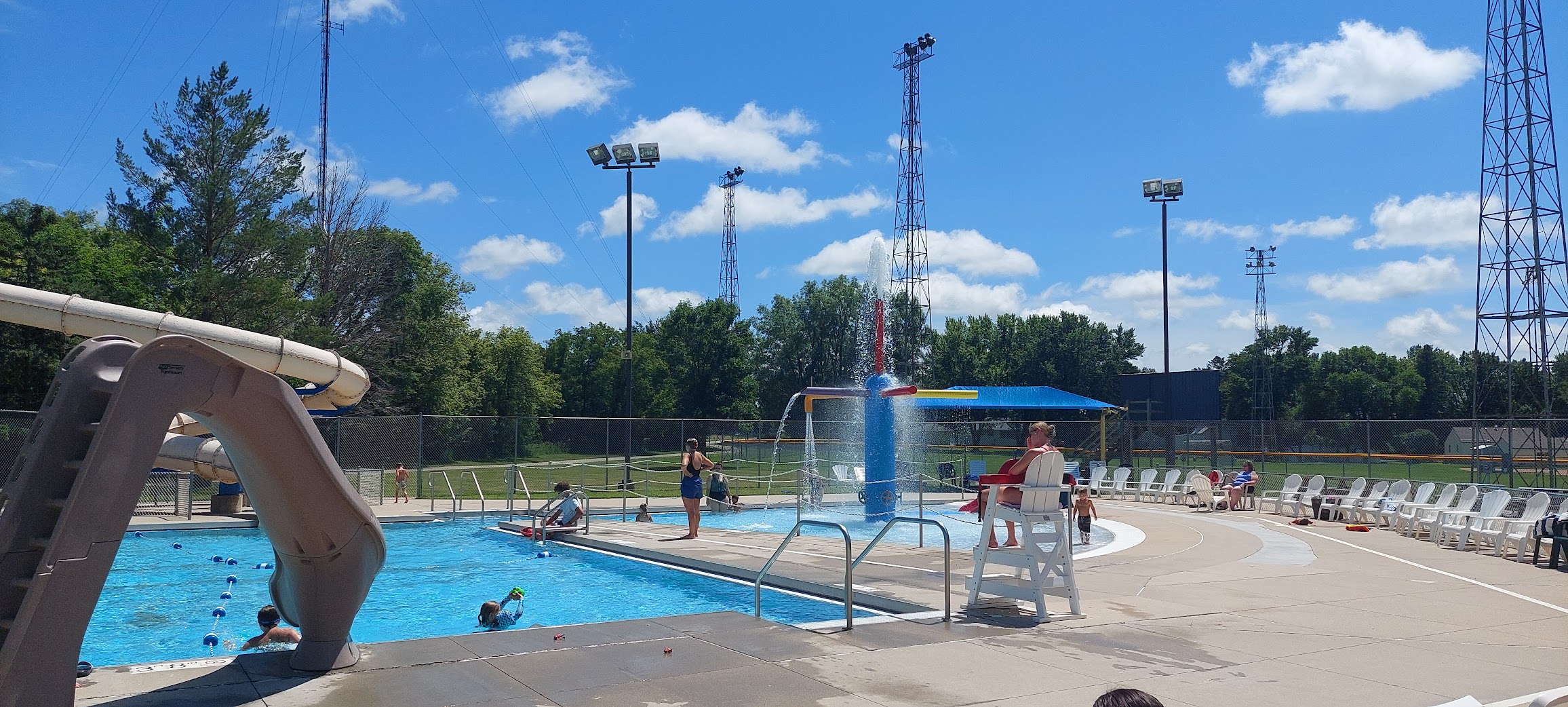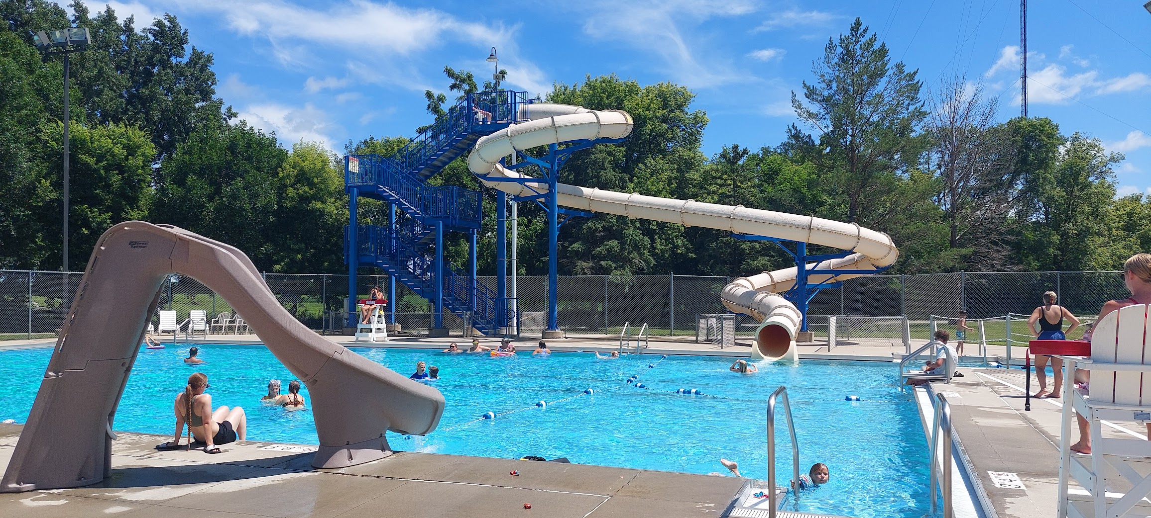 Great pool for the area. There are two water slides at the deep end (10 feet) and lots of space to swim and play where it varies from 4 to 5 feet deep. There's a climbing wall in the 4-5 ft area. There's a small 3.5 ft area with a water slide that is roped off. Then, the reason I am taking a star off--the big water slide. The landing is roped off, but my niece went down it and scraped her knee pretty badly. She said it sped up and turned her so she landed funny. Idk. I'd be wary of the big, enclosed slide. But the lifeguards are friendly and concessions are sold so overall a great place to go.