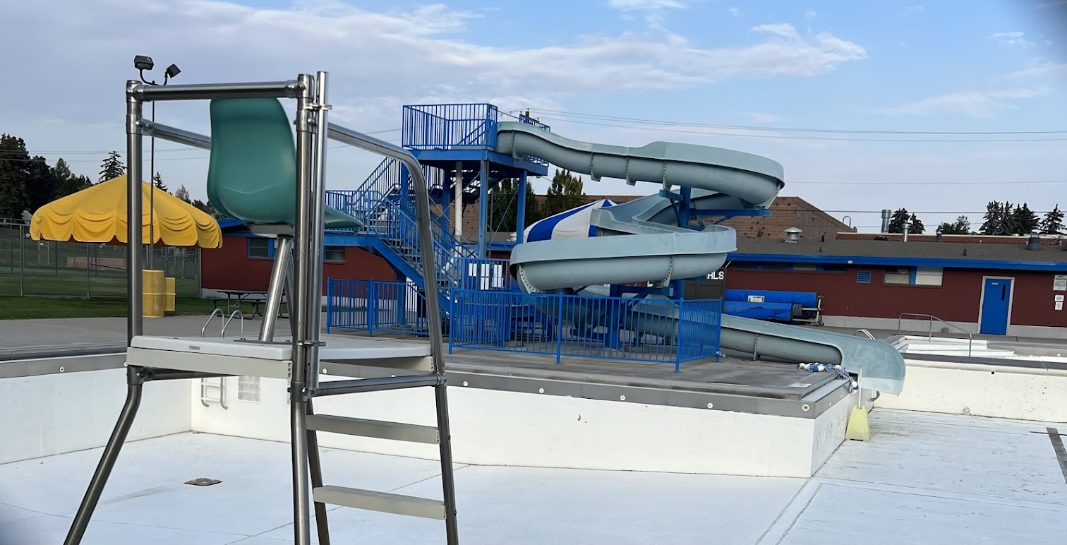 Big public swimming pool with a large slide at a well-rated park.