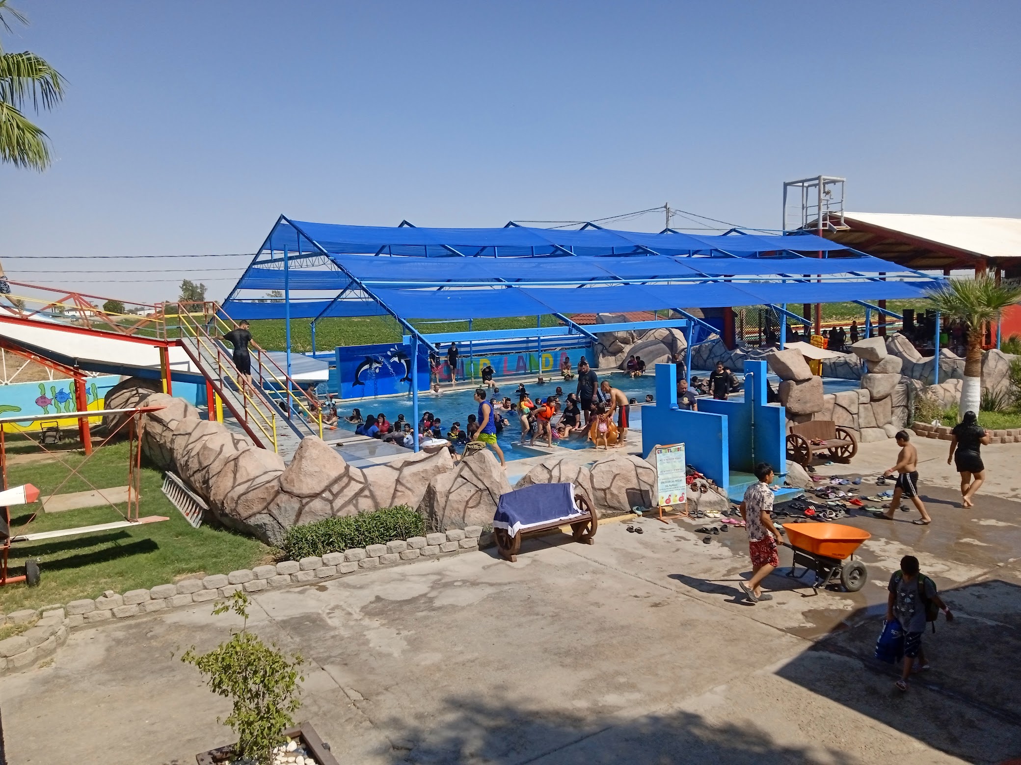 What are people saying (AI review summary)? Reviews suggest a generally positive and fun family atmosphere with good, fast slides, shaded pools, and sufficient space, along with amenities like grills and free trolleys. However, common issues include litter and poor appearance attributed to accessible alcohol, palapas needing maintenance, pools becoming dirty due to overcrowding, and inconsistent enforcement of rules by staff regarding slide closures.
